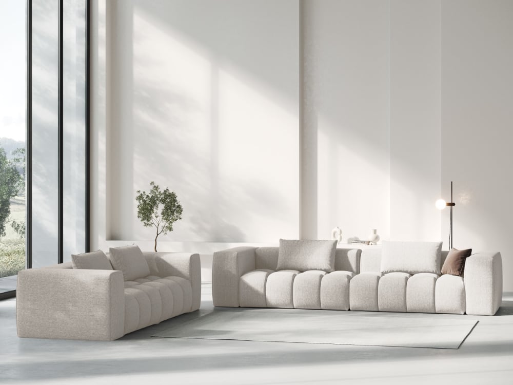 Sorella ist ein strukturierter Polsterstoff, der durch sein interessantes und eindrucksvolles Aussehen besticht. Er zeichnet sich durch ein feines Tweed-Gewebe mit einem klar erkennbaren, regelmäßigen Muster aus. Das Material fühlt sich sehr glatt an, wobei ein zarter Flaum auf der Oberfläche ein angenehmes Gefühl von Weichheit und behaglicher Wärme vermittelt. Inspiriert von der Retro-Ästhetik, verleiht es den Möbeln einen besonderen Charakter von ausgewogenem Luxus. Die Stoffoberfläche ist leicht glänzend, und seine nicht einheitliche, melierte Farbgestaltung fasziniert und zieht Blicke auf sich. Dies bestätigt, dass traditionelle Designansätze in zeitgenössischen Interieurs frisch wirken können. Sorella eignet sich hervorragend für die Polsterung klassischer Möbelstücke, aber auch für große Sofas mit minimalistischen Silhouetten oder abgerundeten Formen. Es neigt dazu, Arrangements im Stil feinster Eleganz zu kreieren. Gleichzeitig besitzt der Stoff praktische Eigenschaften, die den alltäglichen Gebrauch der Möbel signifikant verbessern. Er ist widerstandsfähig gegen Verschleiß, fleckenresistent und einfach zu reinigen. Flecken auf der melierten Oberfläche fallen weniger auf, was es ermöglicht, die Schönheit der Möbel länger zu genießen.