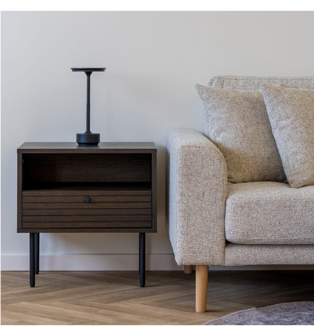 LOGIA Kollektion: Beistelltisch aus geräucherter EicheDesign und Kontrast. Dieser Beistelltisch aus geräucherter Eiche vereint dunkles Holz mit der Eleganz von schwarzem Metall. Ideal als Beistelltisch für ein modernes Ambiente. Die perfekte Kombination aus Material und Form für eine stilvolle Ecke.Masse: B 50 x T 40 x H 50 cm