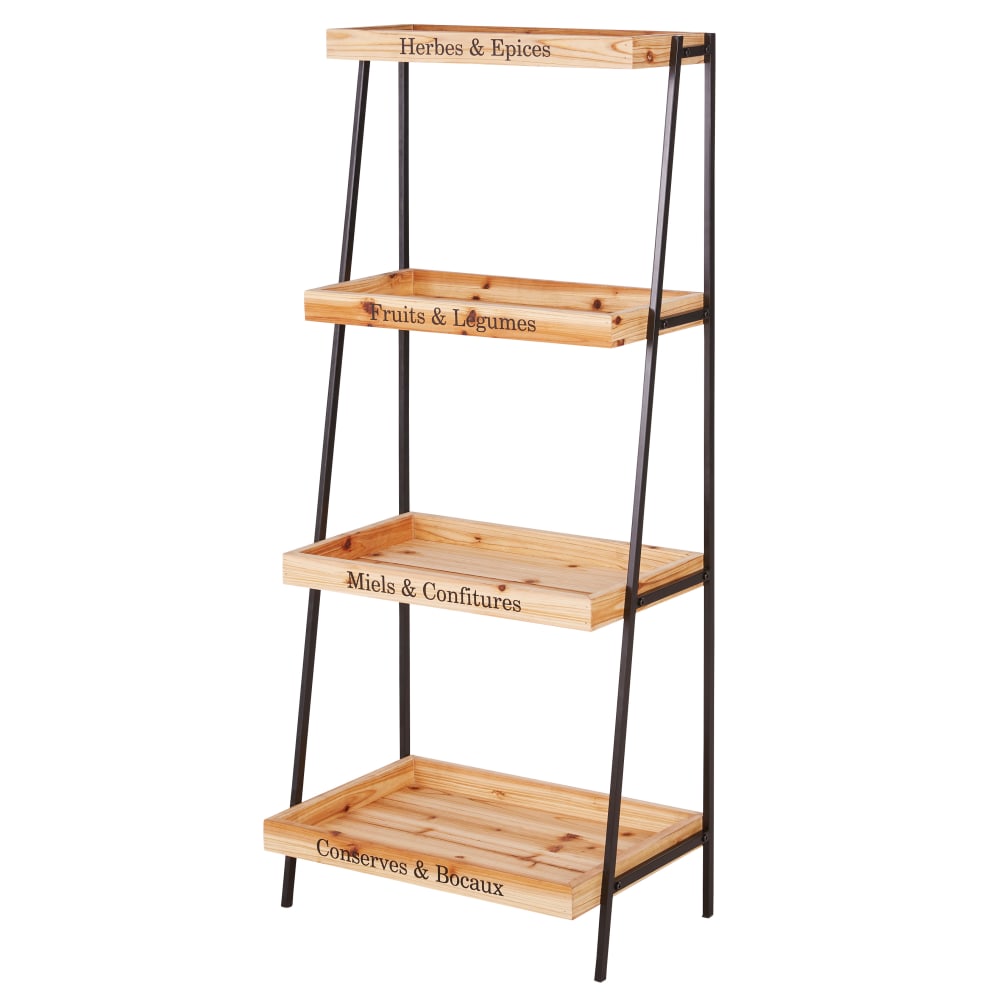 Das aus 4 Fächern bestehende Regal PRIMEURS kombiniert Holz mit Metall und ist ideal, um Ordnung in der Küche zu schaffen.Ganz besonders dekorativ: die schwarzen Schriftzüge auf den Holzfächern, die Ihnen das Sortieren erleichtern werden!Von oben nach unten auf Französisch: herbes et épices (Kräuter und Gewürze), fruits et légumes (Obst und Gemüse), miels (Honig) und zu guter Letzt conserves et bocaux (Konserven und Einmachgläser).Unser Tipp: Betonen Sie den dekorativen Charakter dieses Regals und stellen Sie einen kleinen Blumenstrauß auf einen der Holzböden!