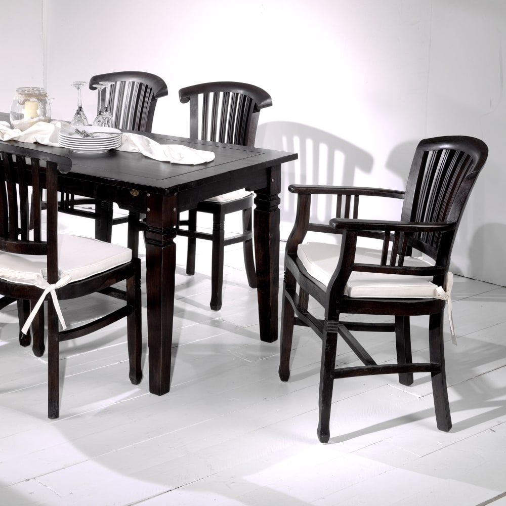Liebevolle Handarbeit, Stil und Charme der Kolonialzeit, Behaglichkeit fern der Hektik des modernen Alltags – alles wichtiger denn je. Aus dem vollen Holz wie vor 100 Jahren und unter Verzicht auf moderne Maschinen bekommt jedes Möbelstück die handwerkliche Individualität, die es heute kaum noch gibt. Kombiniert zum antiken oder rustikalen Design – diese Sitzgelegenheit passt immer und bietet einen bequemen Sitzplatz für Sie und Ihre Gäste. Passend zu diesem Stuhl gibt es auch ein Kissen in Canvas natur (Modell 05998-00) oder in braunem Kunstleder (Modell 05968-00).