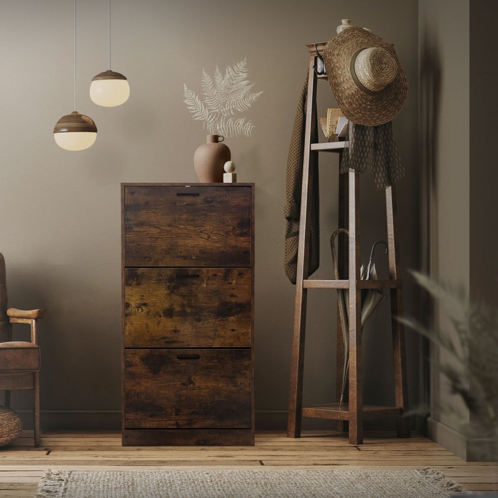Dieser Schuhschrank von ML-Design ist eine ausgezeichnete Aufbewahrungslösung für Ihre Schuhe und bringt Ordnung ins Schuhchaos. Der Schuhschrank besteht aus robusten Spanplatten mit Furnier besitzt 3 Klappfächer die ausreichend viel Platz bieten, um Ihre Schuhe übersichtlich aufzubewahren und platzsparend zu verstauen. Es hat oben eine Fläche, auf der Sie alle Schlüssel oder Buchstaben aufbewahren können, die Sie möglicherweise haben.