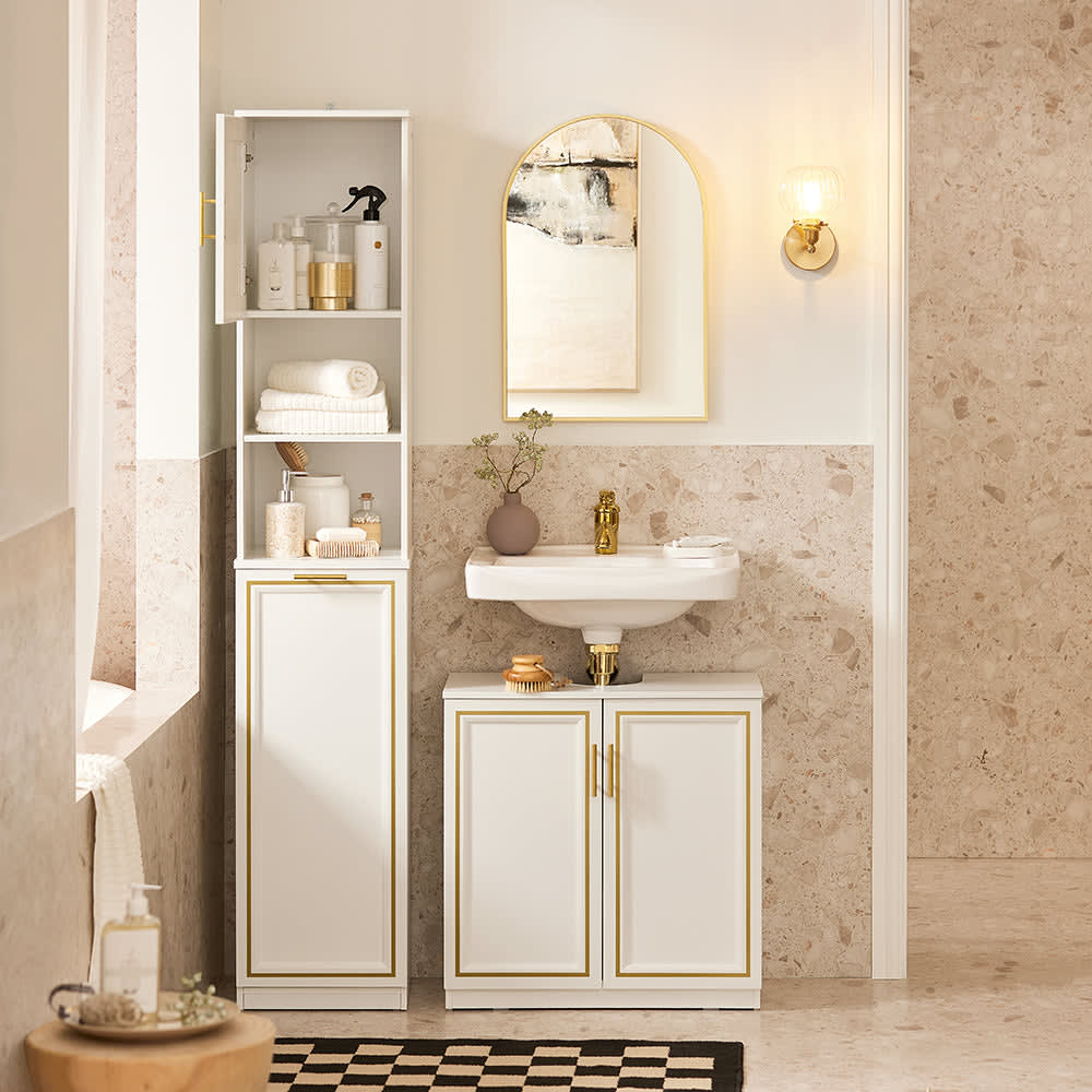 Der Weiß Schrank mit goldenen Griffen sieht ganz besonders aus und er versteckt das unschöne Abflusssystem perfekt.