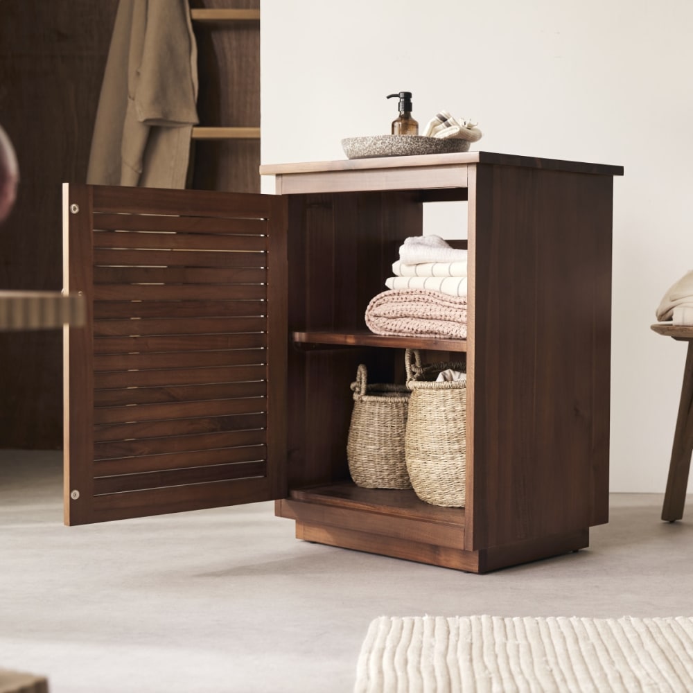 Das Aufbewahrungsmöbel Loggia aus massivem Akazienholz vereint in der Breite 60 cm modernen Stil mit praktischen Eigenschaften, ganz ohne Montage. Besonders in kleinen Badezimmern bilden die Stücke der Kollektion Loggia ein harmonisches Ensemble. Diese Fotos sind 3D-Darstellungen des Loggia-Badezimmermöbels, da diese derzeit in der Produktion sind. Um sich eine bessere Vorstellung von Farbe und Qualität des Holzes zu machen, rufen Sie bitte die Produktblätter der gleichen Produktreihe auf.Zwei Ebenen: – 1 oberes Fach: H. 32 × B. 50,7 × T. 31 cm- 1 unteres Fach: H. 33 × B. 50,7 × T. 31 cmHöhe der Stützfüße: 9 cm (Nutzmaße)Möbel wird einzeln verkauftProduktdetails:Hauptmaterial: AkazienholzMaße: H. 78 × B. 60 × T. 45 cmGewicht: 23,5 kg