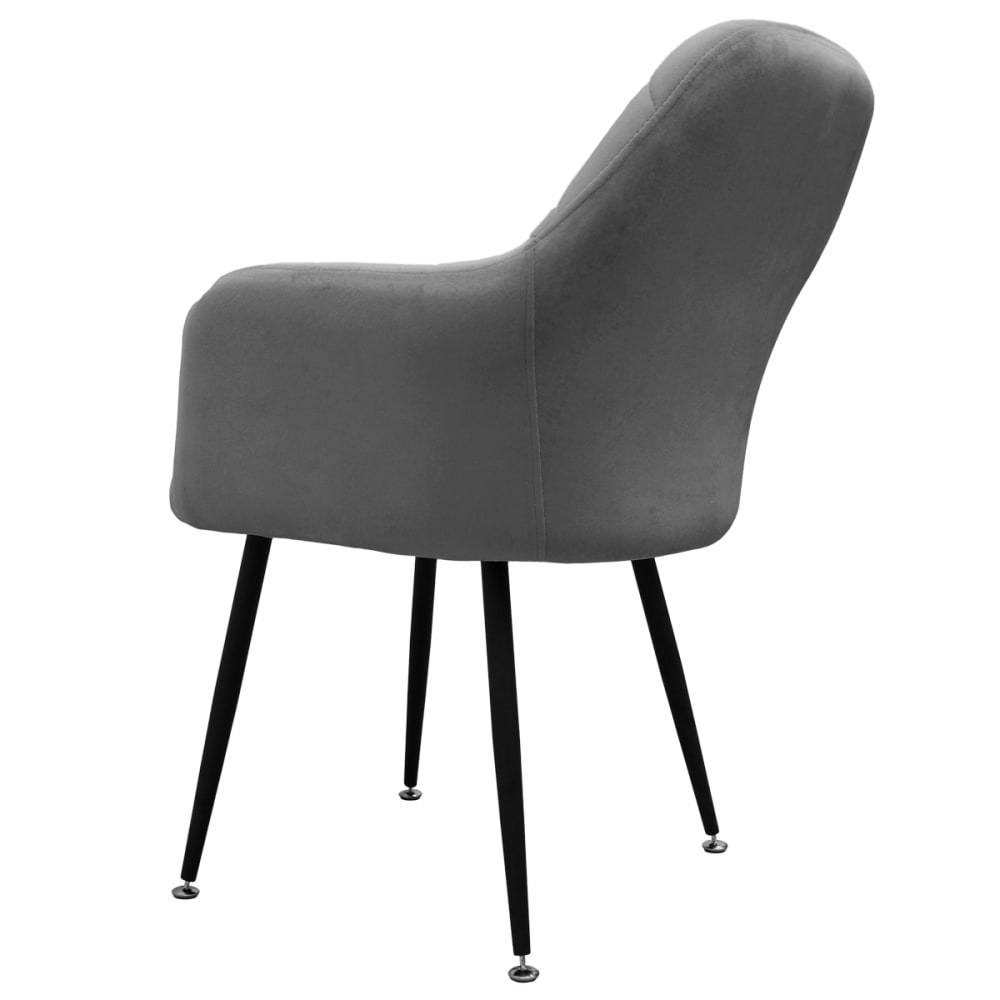Die ergonomische Sitzschale aus hat einen pflegeleichten Microfaserbezug in Samt-Optik. Die Metallfüße mit schwarzer Pulverbeschichtung haben silberfarbene, höhenverstellbare Bodengleiter.