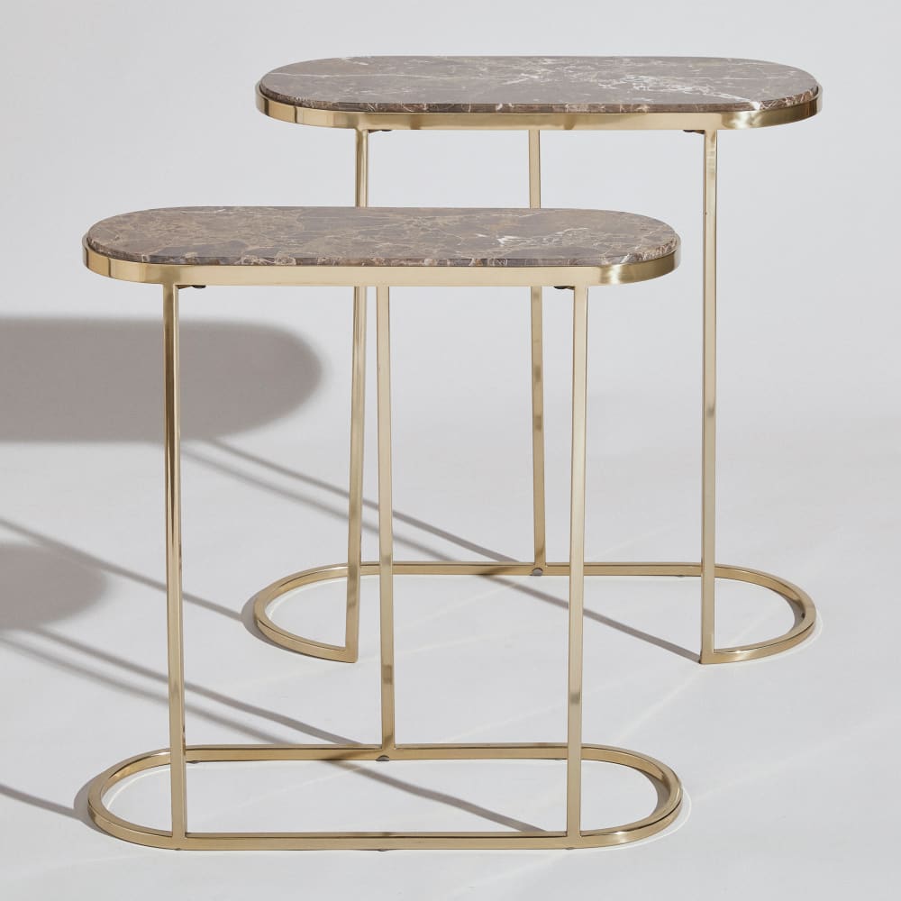 Die BERTILLE Beistelltische aus Marmor und goldfarbenem Stahl (2 Stück) verkörpern Raffinesse und Eleganz und wurden entworfen, um Ihr Interieur zu bereichern.Jedes Stück mit seinem goldfarbenen Stahlgestell und der Marmorplatte verleiht Ihrem Zuhause einen Hauch zeitlosen Luxus und raffinierter Anziehungskraft.Diese Beistelltische sind die ideale Ergänzung für Ihr Wohnzimmer und bieten Platz für eine elegante Lampe, ein inspirierendes Buch oder eine Tasse Tee – charmante und praktische Blickfänge.Ihr Stil fügt sich nahtlos in selbst die elegantesten Einrichtungen ein und setzt mit seinem goldenen Glanz einen stilvollen Akzent.