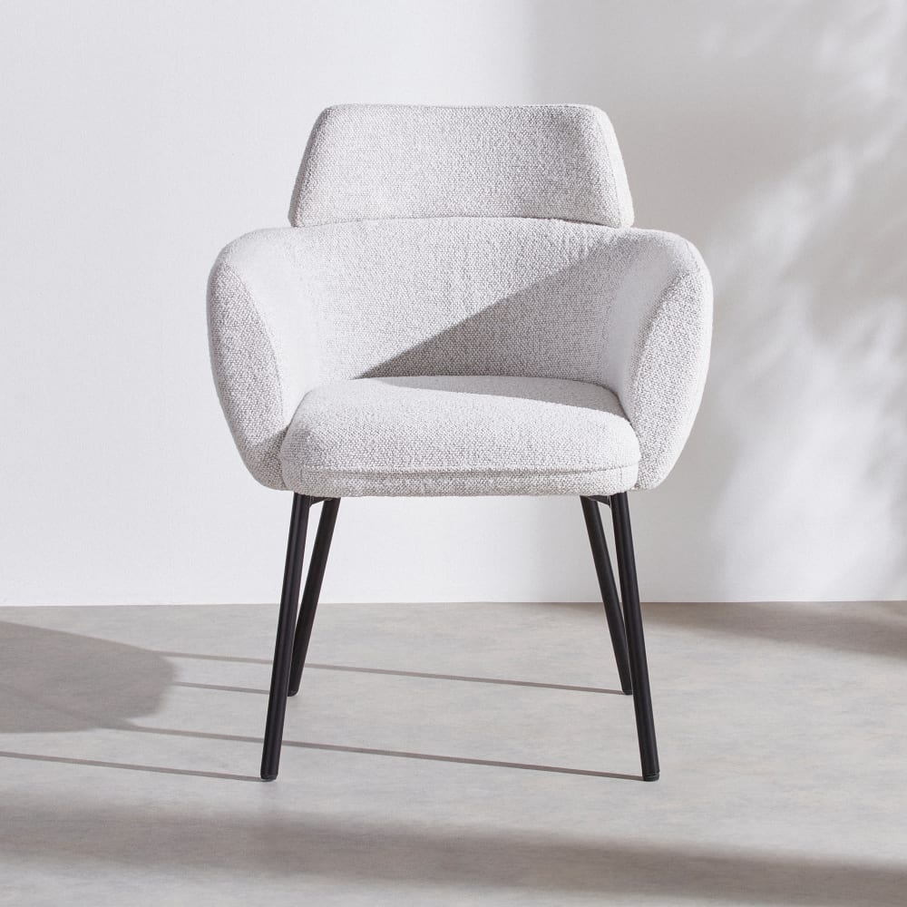 Der Esszimmerstuhl ELLA, eine exklusive Kreation von Maisons du Monde, vereint modernes Design und optimalen Komfort.Sein hellgrauer Bezug aus recyceltem Polyester verbindet Ästhetik mit Umweltverantwortung.Die großzügig gepolsterte Sitzfläche und Rückenlehne laden zu entspannten Stunden am Esstisch ein.Die schwarzen Stahlbeine verleihen dem Stuhl einen Hauch von Modernität und Eleganz und fügen sich perfekt in jedes moderne Interieur ein.
