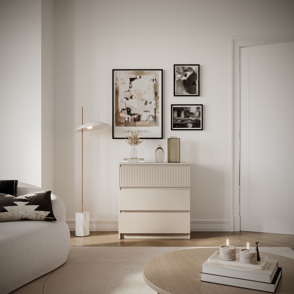Sandia zieht Blicke auf sich – nicht nur durch ihren durchgängig matten Kaschmir-Farbton, der aktuell voll im Trend liegt und eine ruhige, einladende Basis schafft. Das wahre Highlight ist die stilvolle Riffelung der Front. Dieses strukturierte Design verleiht der Kommode eine besondere Haptik und visuelle Tiefe.