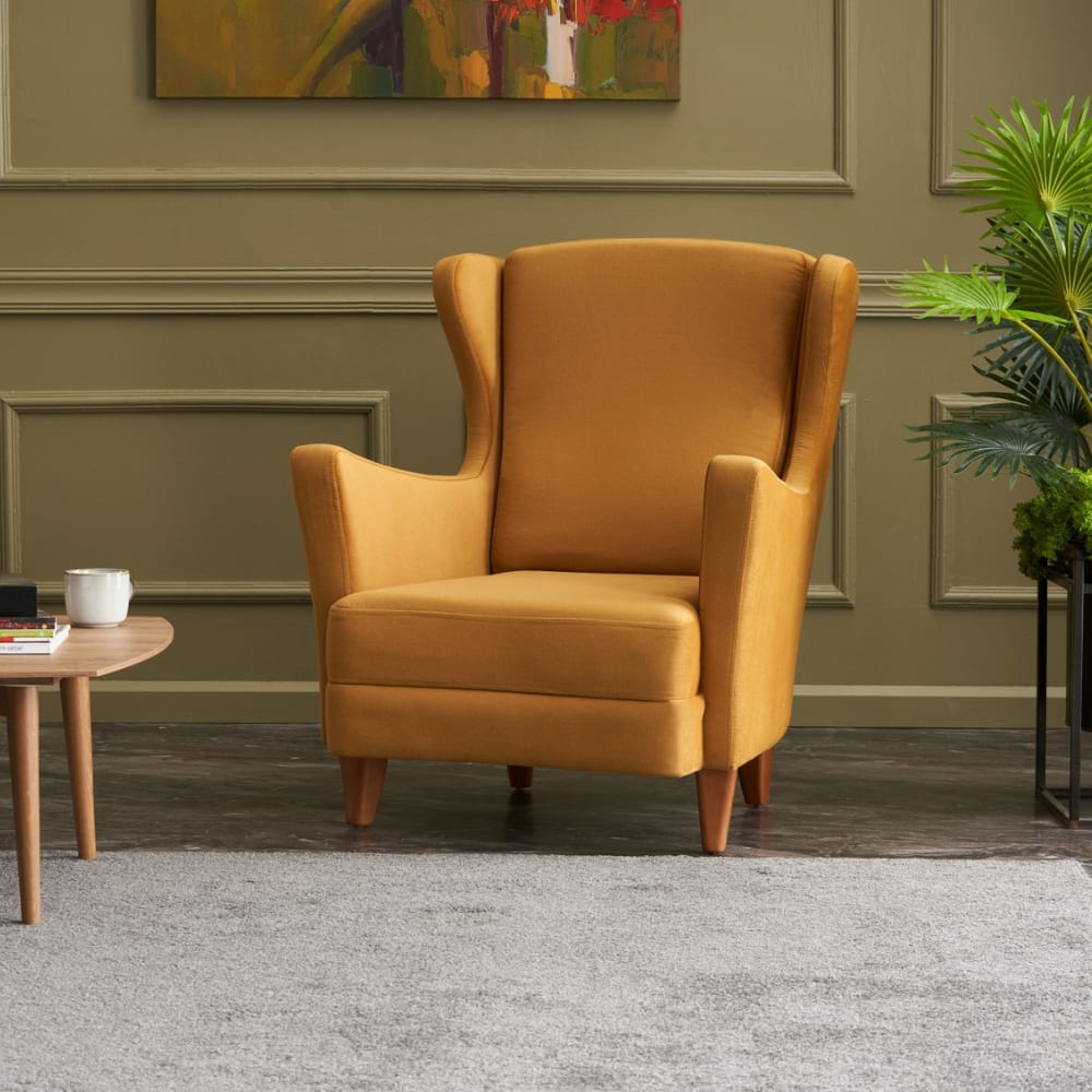 Bringen Sie einen Hauch von Vintage-Charme und Modernität in Ihr Zuhause mit diesem Sessel, erhältlich in senfgelb oder grün, eleganten und warmen Farbtönen. Sein überarbeitetes Ohrendesign, kombiniert mit einer Holzstruktur und Füßen aus Buchenholz, macht ihn zu einem zeitlosen Stück, das sowohl in ein modernes Wohnzimmer als auch in einen Retro-Raum passt.Bequem und einladend verfügt er über eine großzügige Sitzfläche (10 cm hochdichte Schaumstoff, 32 DNS) und eine umschließende Rückenlehne, perfekt für Ihre Entspannungsmomente. Einfach zu montieren und leicht zu pflegen, wird dieser Sessel schnell Ihr Lieblingsplatz für gemütliche und entspannende Augenblicke, während er Ihre Dekoration verschönert.Technische EigenschaftenFarbe: SenfgelbBezug: SamtMaterial der Struktur: BuchenholzFüße: BuchenholzSitz: 10 cm Schaumstoff 32 kg/m³Rückenlehne: Schaumstoff 26 kg/m³MontageEinfache Montage. Eine Montageanleitung ist enthalten.PflegeMit einem feuchten Tuch abwischen. Maße Gesamtmaße: 77 x 80 x 98 cmGesamtgewicht: 18,5 kgHöhe der Füße: 20 cmHöhe der Rückenlehne: 60 cmSitztiefe: 55 cmSitzhöhe: 40 cmSitzbreite: 55 cm VerpackungDas Produkt ist in 1 Paket mit den Maßen: 80 x 80 x 90 cm / 20 kg verpackt.