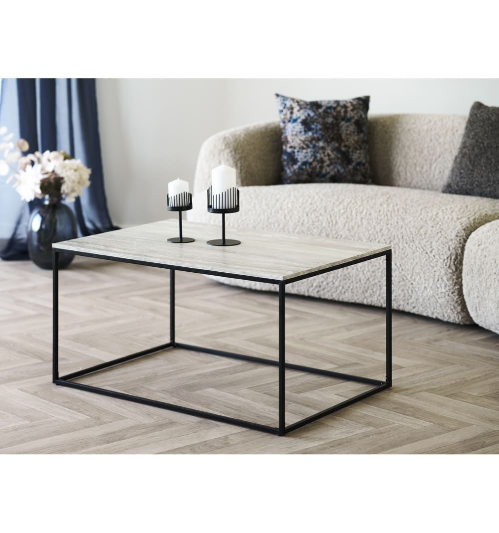 CHIC Kollektion: Couchtisch in Travertin-OptikElegante Eleganz in Mineraloptik. Dieser quadratische Couchtisch in Travertin-Optik ist ein trendiges Möbelstück. Seine Tischplatte in Travertin-Optik ruht auf einem schwarzen Metallgestell. Die perfekte Kombination aus Material und Form für ein stilvolles und modernes Wohnzimmer.Masse: L 960 x B 60 x H 45 cm