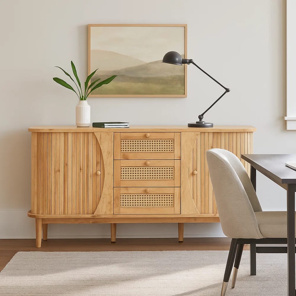 Dieser Schrank besticht durch seinen einzigartigen Look, der Retro-Stil elegant mit moderner Konstruktion verbindet. Die gerippten Türen und die Schubladen aus natürlichem Rohrgeflecht erinnern an handwerkliche Handwerkskunst und bewahren gleichzeitig einen schlichten Stil, der perfekt zu professionellen Räumen passt. Das natürliche, helle Holz erhellt den Raum und fördert eine ruhige Arbeitsatmosphäre.