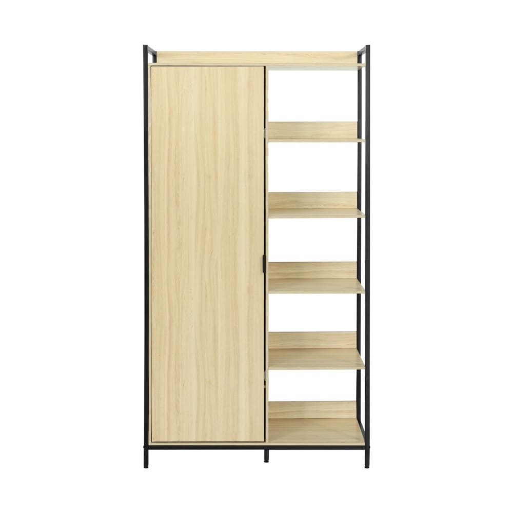 Dieses ultrapraktische Modul verfügt über einen offenen und einen geschlossenen Bereich. Diese sind nicht austauschbar. Es verfügt über eine Kleiderstange, die ideal zum Aufhängen von Jacken und Hemden geeignet ist, und sechs Regale, auf denen Ihre Kleidung ordentlich gefaltet aufbewahrt wird. Der Kleiderschrankteil auf der linken Seite ist hinter einer großen Tür verborgen.