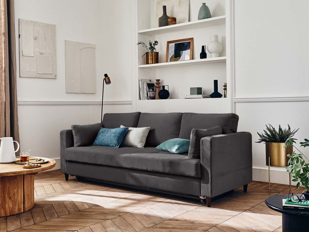 Anna – canapé droit 3 places convertible avec poche en velours 222x85x89cm Samt Grau Lisa Design Sofas und Sessel Sofas Schlafsofas