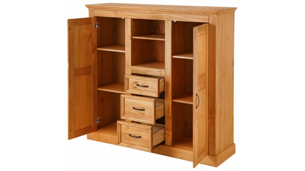 Das schicke Anrichte rückt mit seinem attraktiven Design schnell in den Mittelpunkt. Der Schrank aus FSC®-zertifiziertem Massivholz ist in verschiedenen farbigen Ausführungen mit sichtbarer Holzstruktur erhältlich und entspricht damit dem modernen Landhaus-Look. Türen und Schubladen sind mit Metallgriffen ausgestattet. Die Vitrine kann im Wohn- oder Essbereich aufgestellt werden, macht aber auch im Schlafzimmer eine gute Figur. Besonders praktisch ist der Bereich hinter den Türen. Dort befinden sich mehrere Holzeinlegeböden, die Platz für viele Dinge bieten. In den Schubladen, die auf Metallschienen laufen, lassen sich viele Kleinigkeiten verstauen.