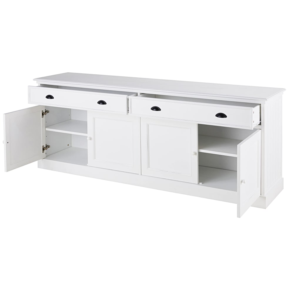 Sie wünschen sich ein Möbel, das Stil und Funktionalität vereint? Setzen Sie auf das 4-türige Buffet NEWPORT mit den 2 Schubladen! Egal, ob es in Ihrem Ess- oder Wohnzimmer oder in Ihrer Küche steht, es lässt Ihre Einrichtung in jedem Fall frisch wirken. Wir lieben dieses weiße Buffet, das an die Möbel aus Ferienhäusern an der Küste erinnert. Es ist dank der vielen Fächer sehr praktisch und bietet viel Platz für Ihr Geschirr oder Ihre Heimtextilien. Uns gefällt es, und Ihnen?