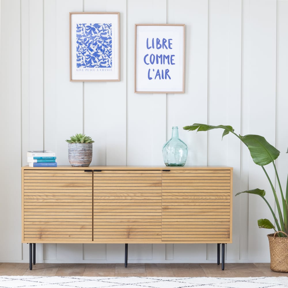 Entscheiden Sie sich für das Sideboard Stinna, um Ihren Wohnraum zu verschönern. Es bietet eine praktische und ästhetische Lösung, die Geschirr, Küchenutensilien und andere Alltagsgegenstände elegant aufnimmt. Das clevere Design von Stinna ermöglicht eine individuelle Anpassung des Stauraums und bietet somit maximale Funktionalität für Ihre Bedürfnisse. Der Stinna ist pflegeleicht und sieht auch nach langer Zeit noch gut aus. Das Sideboard Stinna im skandinavischen Stil vereint Schlichtheit und nordische Eleganz und verleiht Ihrem Zuhause einen modernen und klaren Touch. Mit 3 Türen und 3 Regalen im Inneren ist dieses skandinavische Sideboard die ideale Lösung, um Ihr Esszimmer mit Stil und Raffinesse zu organisieren. Details: Abmessungen: Geschirrschrank: L 150 x B 40 x H 74cm, Beine: l 2 x H 20cm, Dicke der Bretter: 1,6cm . Materialien : Gestell: Spanplatte, Beine: Stahl . Farben : Gestell: Holz, Beine: schwarz . Zusätzliche Informationen : Verwendung: Innenbereich, Anzahl der Regalböden: 3, Max. unterstütztes Gewicht: 100kg, Max. unterstütztes Gewicht Regal : 20kg, Zum Zusammenbauen (inkl. Anleitung).