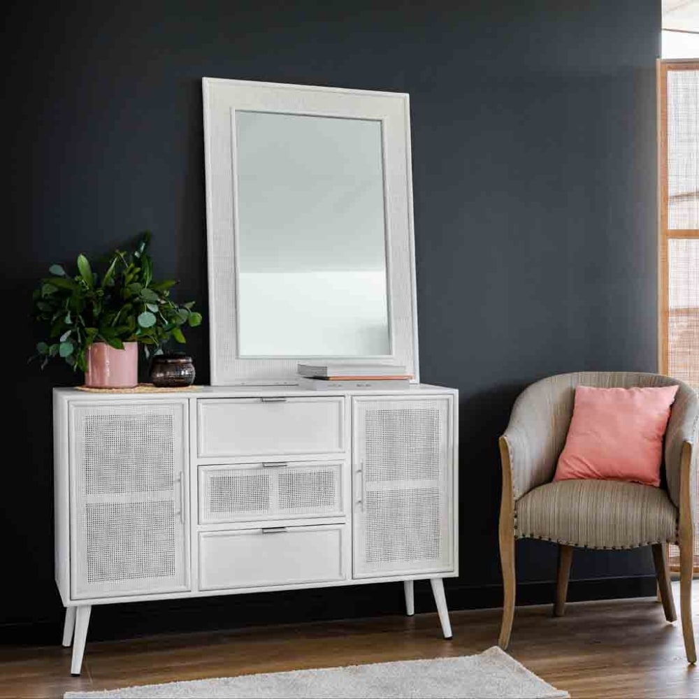 Weißes Sideboard mit Holz- und Bambusgitter 120×40,5×81 cm Verleihen Sie Ihrem Schlafzimmer einen neuen Look mit den neuesten Beiträgen im nordischen Stil, der neue Designs, Materialien und avantgardistische Kombinationen umfasst. Dieses Sideboard ist ein idealer Vorschlag für seine elegante und raffinierte Ästhetik, hergestellt aus einer Kombination von MDF-Holz und Bambus. Die Anrichte mit nordischer Ästhetik hat 3 Schubladen und 2 Schränke. Das Design der Fronten ist gemischt und kombiniert die glatte Oberfläche mit dem Bambusgitter, was einen eleganten visuellen und ästhetischen Effekt erzeugt. Die silberfarbenen Metallgriffe verleihen dem Möbelstück einen einzigartigen und vornehmen Charakter. Seine Maße und Eigenschaften sind: Länge: 120 cm. Höhe: 81 cm. Breite: 40,5 cm. Material: MDF-Holz und Bambus