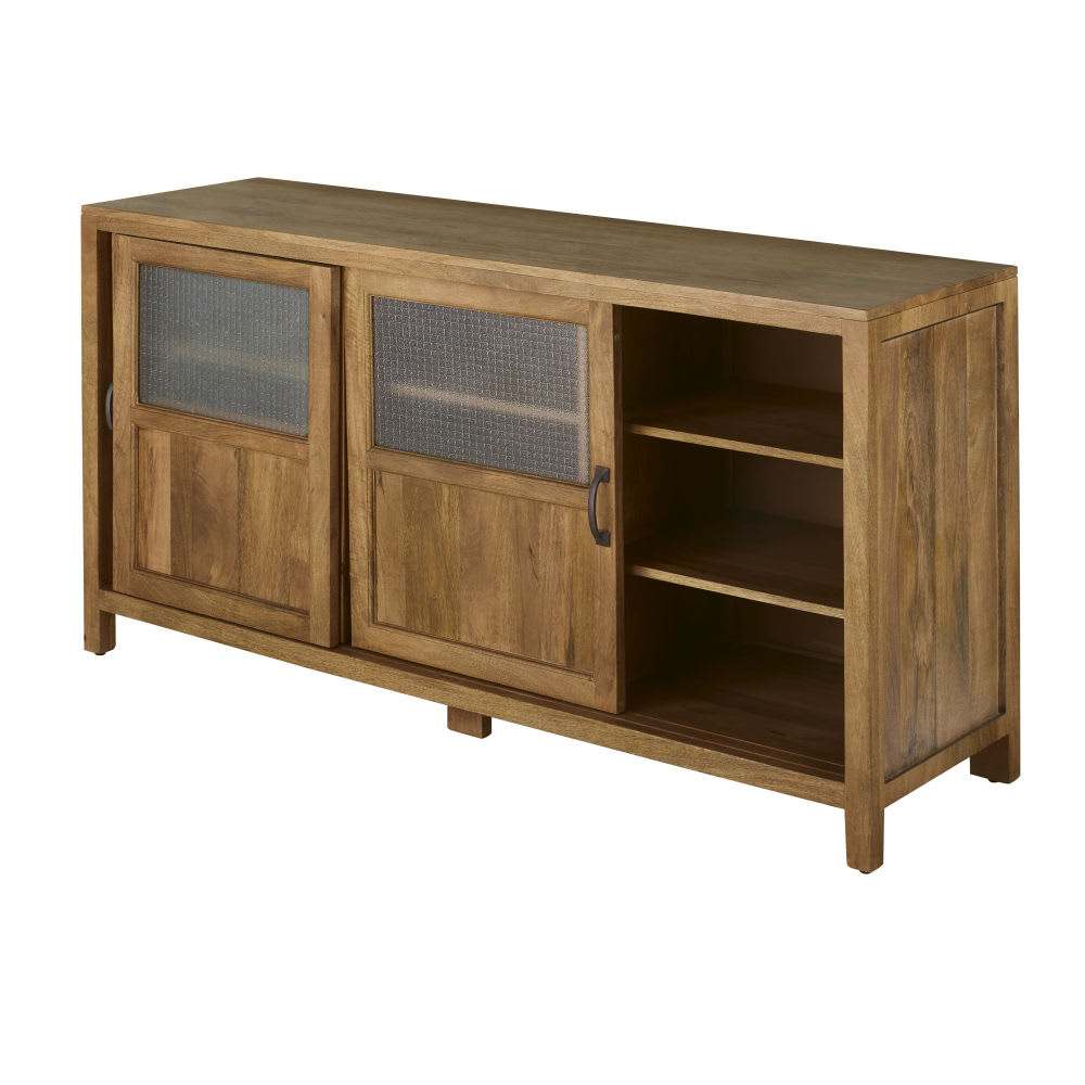 Die Anrichte BARYTON mit 3Schiebetüren und Drahtglasfenstern ist ein charmantes und praktisches Möbelstück.Dank der Schiebetüren aus Drahtglas gelangen Sie leicht an Ihre Lieblingssachen, die gleichzeitig vor Staub und Schmutz geschützt sind.Das moderne Design dieser Anrichte wird durch den Korpus aus Mangoholz ergänzt, der sich problemlos in jeden Einrichtungsstil einfügt.Die schwarzen Metallgriffe verleihen der Anrichte mit 3Türen einen Industrial-Touch.In Sachen Aufbewahrung verfügt sie über 6 Regale, um Geschirr und andere Tischutensilien ordentlich zu verstauen.Diese Anrichte mit 3Türen ist eine Eigenkreation von Maisons du Monde.