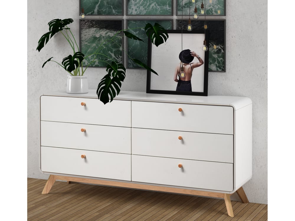 Verbessern Sie Ihr Schlafzimmer mit dieser eleganten Anrichte im modernen skandinavischen Design. Sie besteht aus pflegeleichtem laminiertem Spanplattenmaterial. Die 6 Schubladen bieten viel Platz für verschiedene Verwendungszwecke. Die Anrichte vervollständigt ihren Stil mit Holzknöpfen, harmonisierten Farben, abgerundeten Ecken und ausgestellten Beinen. Sie kann mit dem mitgelieferten Montagesatz leicht zusammengebaut werden. Dank ihres zeitlosen Designs fügt sich diese Anrichte problemlos in alle bestehenden Einrichtungsstile in Ihrem Raum ein.