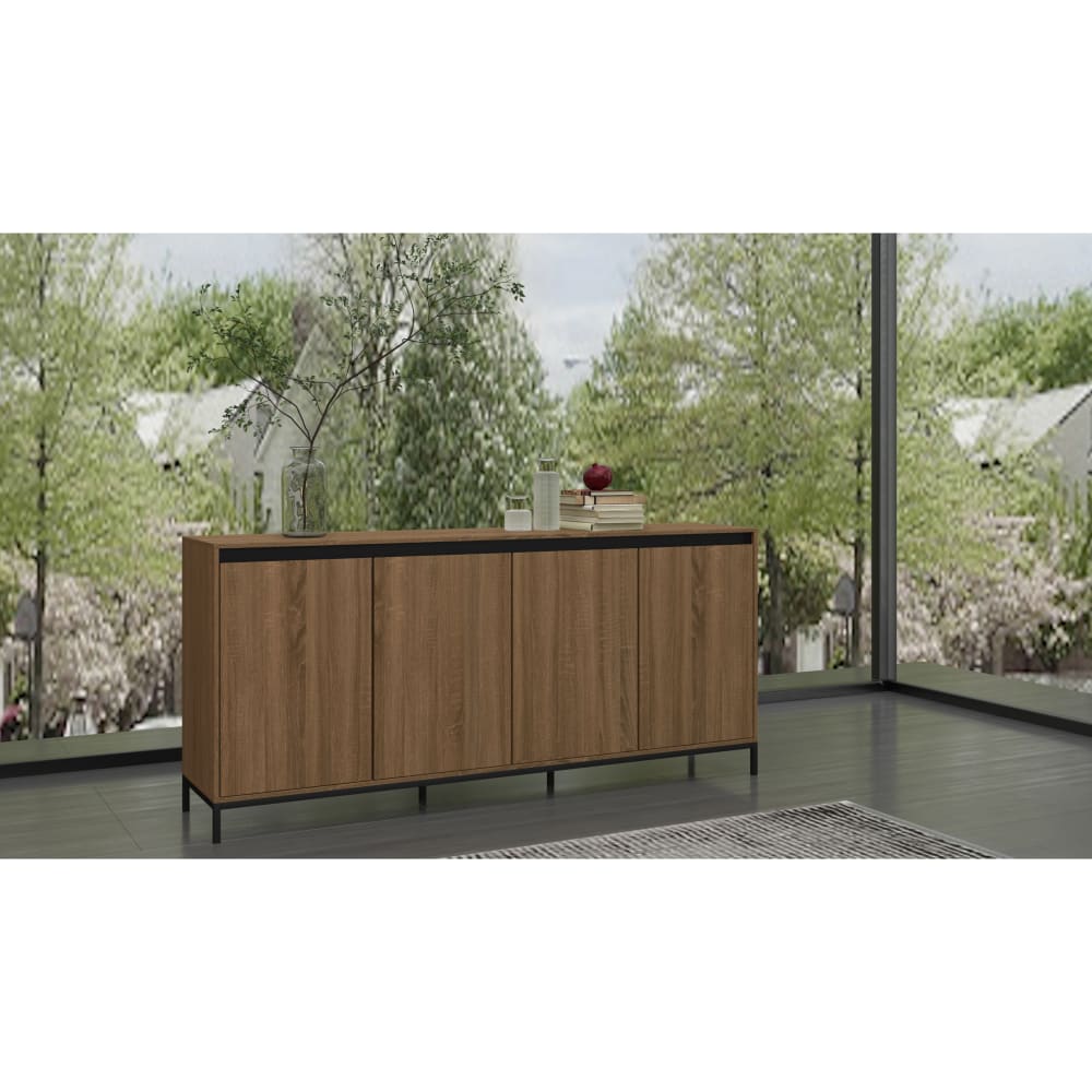 Diese kompakte Anrichte mit einer Breite von 175 cm verfügt über 4 Türen und 2 feste Regale, die reichlich Stauraum bieten. Hergestellt aus stabilem Holzmaterial mit einem Metallrahmen, trägt sie bis zu 40 Kilogramm. Das grifflose Design mit Griffstangen verleiht einen modernen Touch. Ideal für Wohnzimmer oder Essbereiche. Sie bietet vielseitigen Stauraum und eine stilvolle Oberfläche für Dekorationen.