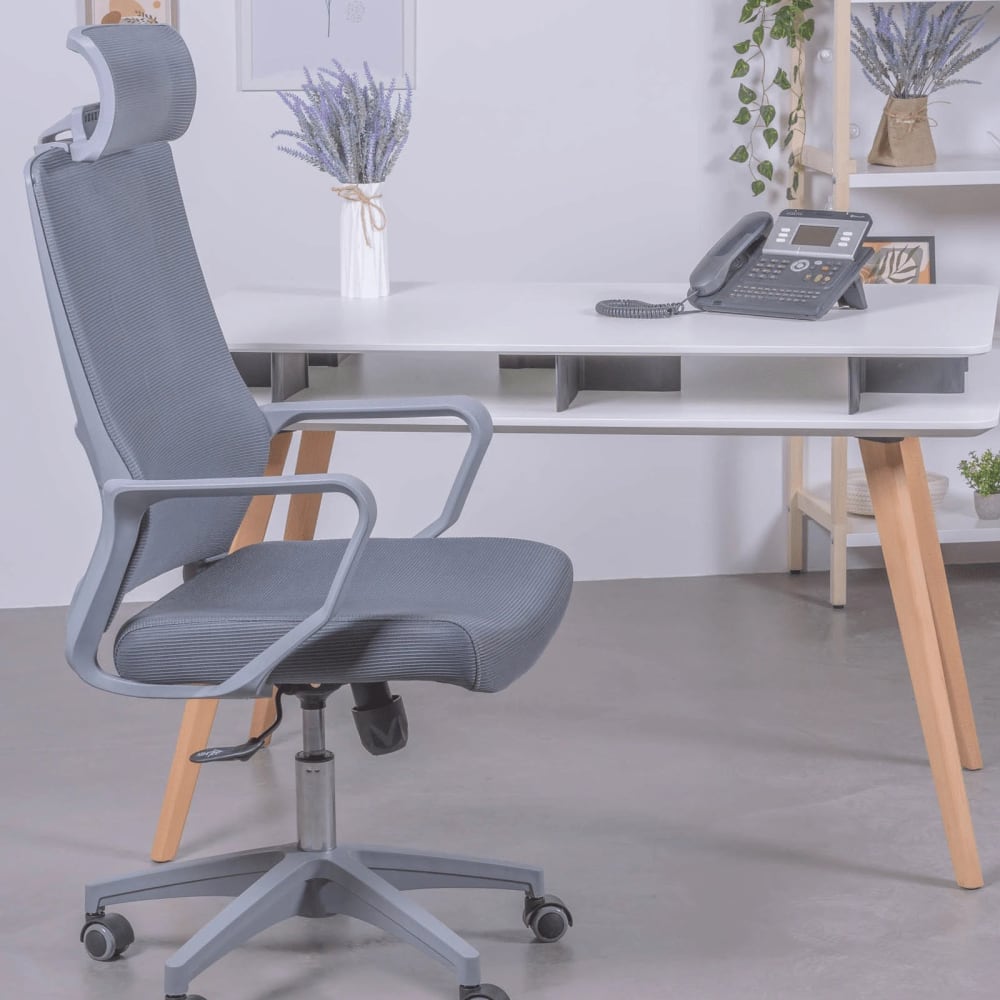 Der ergonomische Bürostuhl mit hoher Rückenlehne und verstellbarer Kopfstütze verfügt über eine Lordosenstütze zur Erleichterung der Körperhaltung und ist somit perfekt für lange Arbeitstage. Es besteht aus atmungsaktivem und kühlem Mesh, das leicht zu reinigen ist und dazu beiträgt, die Raumtemperatur zu jeder Jahreszeit aufrechtzuerhalten. Seine weiße Kunststoffstruktur aus Polypropylen verleiht ihm Leichtigkeit und große Eleganz. Seine Höhe ist mittels eines Gaskolbens verstellbar, wodurch der Sitz angepasst werden kann. Es hat Räder für einfache Handhabung und Mobilität. Er ist der ideale Stuhl für Büros, Arbeitsstudios und Gamer. Atmungsaktives Netz Das atmungsaktive Netz ist ein leichter Stoff, der Schweiß durchlässt, dadurch leicht zu reinigen ist und die Ansammlung von Schmutz und Staub verhindert. Stühle aus diesem Material sind bequem und zeichnen sich durch Ergonomie aus, da sie sich perfekt an den Benutzer und seine Bewegungen anpassen. Verstellbare Sitzhöhe Der Gaskolben ist ein Zylinder mit einem gasbetriebenen Mechanismus, der es ermöglicht, die Sitzhöhe in Stühlen und Hockern zu regulieren. Da sich der Stuhl leicht verstellen lässt, können Sie Ihre Füße in einem optimalen Winkel zum Boden stellen und erhalten so Ihre körperliche Gesundheit. Kopfstütze Kopfstütze für besseren Komfort während langer Arbeitszeiten. Die Kopfstütze kann entfernt und bei Bedarf ersetzt werden.