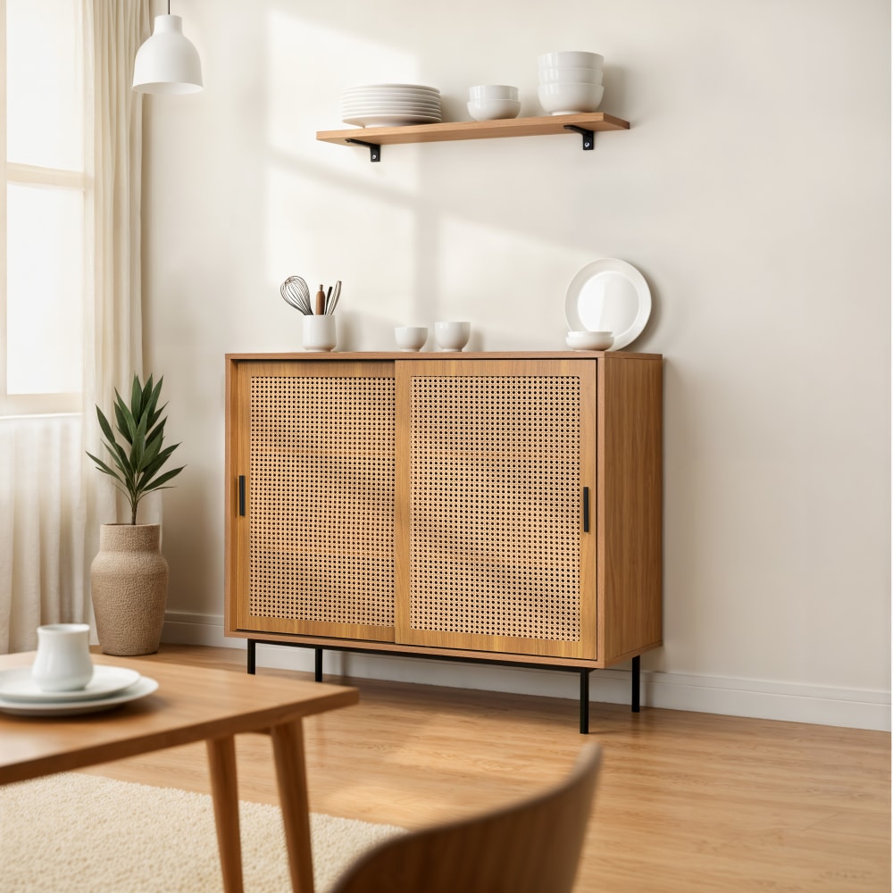Elegantes und modernes Design: Ein Naturholzschrank mit Türen aus Rohrgeflecht für eine edle Optik.
