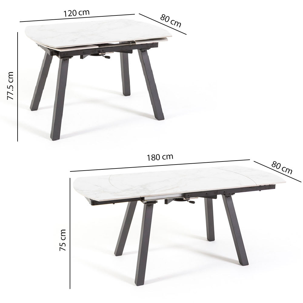 Der ausziehbare Tisch Ricky ist die perfekte Lösung für alle, die Eleganz und Praktikabilität in einer einzigen Einrichtungsergänzung vereinen möchten. Seine Keramikplatte mit Marmoreffekt bietet eine raffinierte, widerstandsfähige und leicht zu reinigende Oberfläche, ideal für moderne und elegante Umgebungen. Dank eines innovativen Rotationsmechanismus verwandelt sich der Tisch schnell von einer kompakten Größe von 120×80 cm auf eine Länge von 180×80 cm mit der Öffnung der beiden seitlichen Verlängerungen. Dieses Erweiterungssystem ermöglicht es, mehr Platz zu gewinnen, um Gäste und Familie zu empfangen, ohne das Design zu opfern. Die Struktur aus lackiertem Stahl mit geneigten Beinen gewährleistet maximale Stabilität und fügt einen zeitgenössischen Touch hinzu. Der Kontrast zwischen dem Marmoreffekt-Finish und dem Metall verleiht diesem Tisch eine raffinierte Ästhetik, perfekt für Küche oder Esszimmer. Funktional, elegant und robust ist der ausziehbare Tisch Ricky die ideale Wahl für alle, die Vielseitigkeit und Stil in einem einzigen Einrichtungselement suchen.