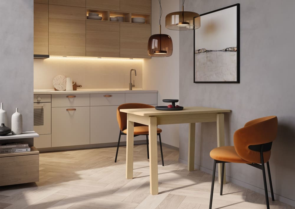 Mit seiner rechteckigen Grundform und einer Breite von 104 cm fügt sich der Tisch harmonisch in kompakte Küchen, Essbereiche oder Apartments ein. Durch drei separate Einlegeplatten lässt er sich bei Bedarf auf bis zu 224 cm verlängern ideal für Familienfeiern, Gäste oder kreative Arbeitsbereiche.