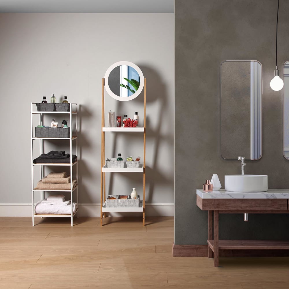 Badezimmerschrank mit 5 Regalböden aus Bambus und Metall, weiß von Versa Home