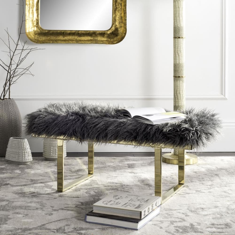 Inspiriert von den Interieurs der Hollywood-Sirenen, ist die Faux Sheepskin Bench ein moderner Genuss. Plüschiges graues, gelocktes Schafsfell wird mit einer eleganten Messingplatte kombiniert, die sich ideal als Sitzgelegenheit im Wohnzimmer oder als Frühstückstablett im Boudoir eignet.