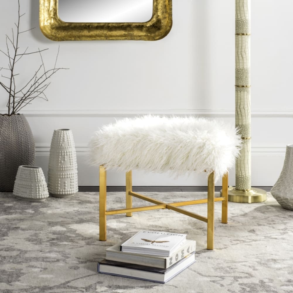Die X-Quadrat-Bank aus Kunstschaffell wurde für den modernen Geschmacksbewussten entworfen. Umhüllt von einem reichen Goldfolien-Finish und weißem, gelocktem Schafslederimitat ist sie dank ihres klassischen Stils ideal als Sitzgelegenheit im Wohnzimmer, im Schlafzimmer oder in einer Nasszelle, die sofortigen Elan braucht.