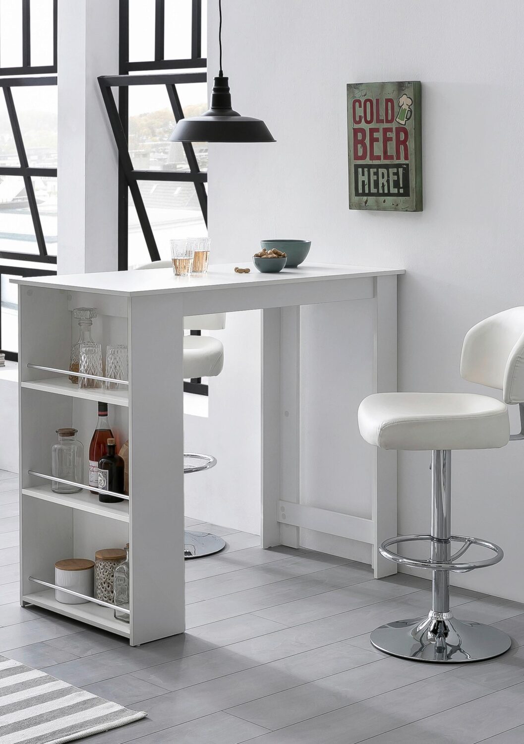 Dieser Bartisch in Weiß ist ein trendiger Blickfang für Ihr Zuhause. Ob zum gemütlichen Frühstück oder dem entspannenden Cocktail am Abend – dieser Bartisch macht immer eine gute Figur. Der Bartisch aus MDF ist melaminharzbeschichtet und verfügt über 3 offene Fächer in denen sich Gläser und Flaschen griffbereit unterbringen lassen.
