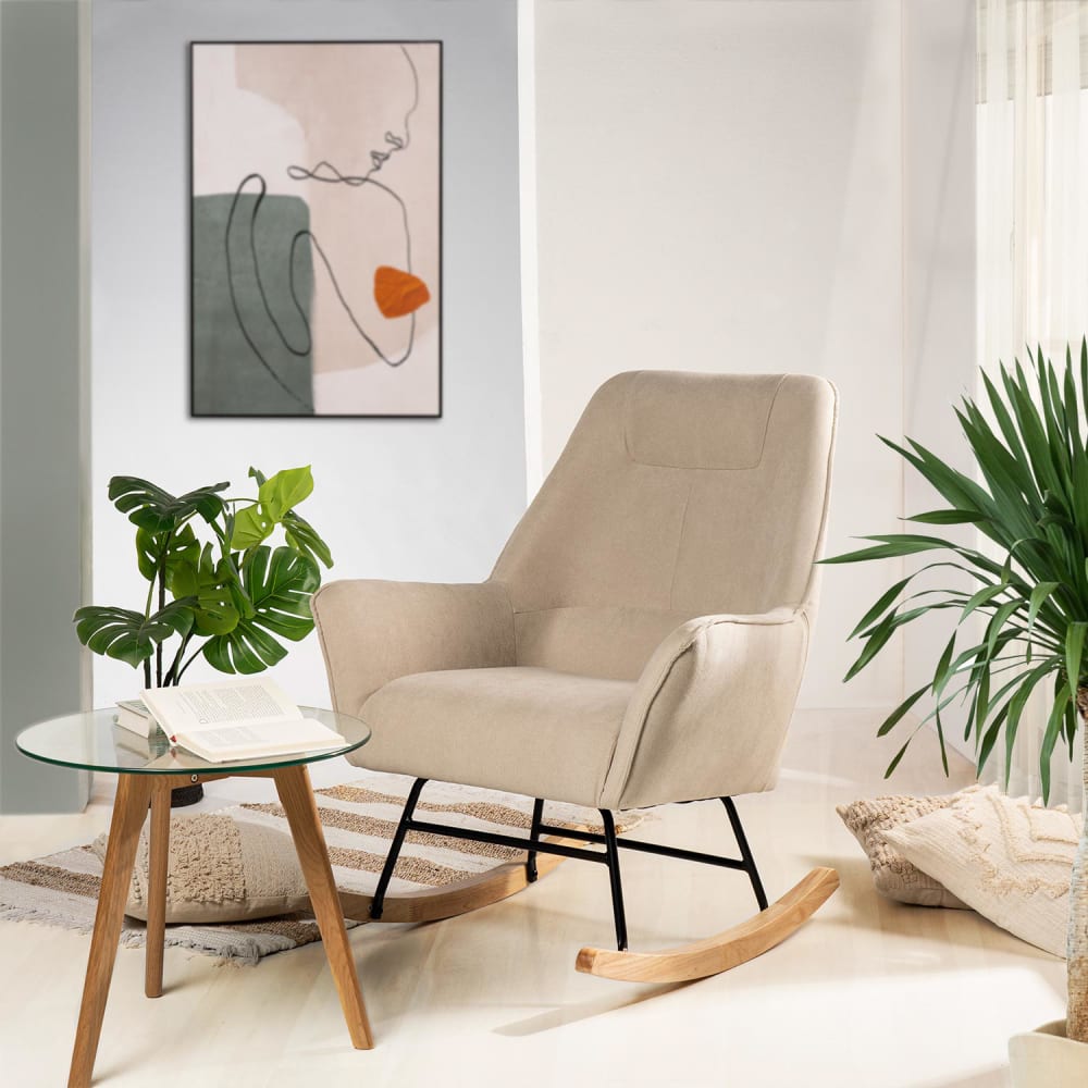 Beiger gepolsterter Schaukelstuhl mit Eichenbeinen. von Koketto Home