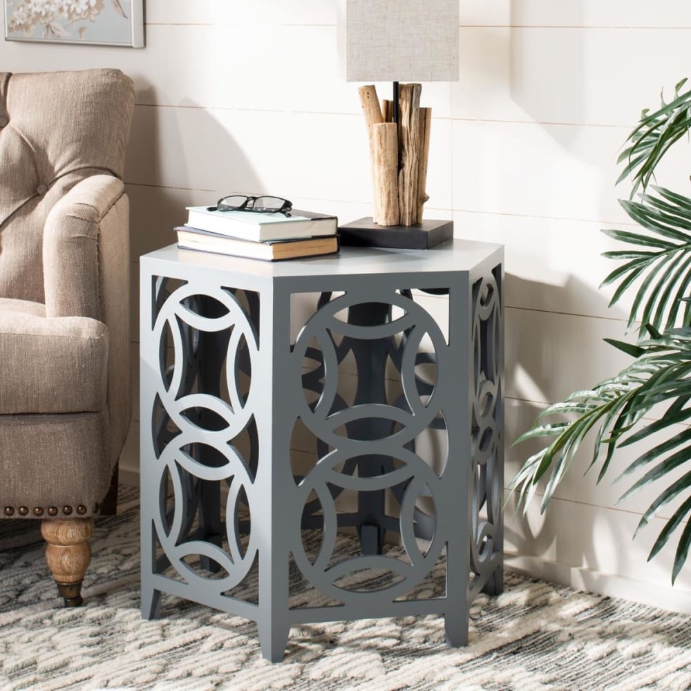 Was gut ist, ist gut. Machen Sie sich die kreisförmige Logik zu eigen mit dem Beistelltisch Natanya. Dieser schicke Beistelltisch verleiht mit seinen ineinandergreifenden Kreisen und den klaren Linien seiner sechseckigen Tischplatte modernen Charme. Natanya ist aus Bayur-Holz in perlblau-grauer Lackierung gefertigt und eignet sich perfekt für klassische Interieurs, die einen gewissen Schwung brauchen, aber auch für moderne Wohnräume.