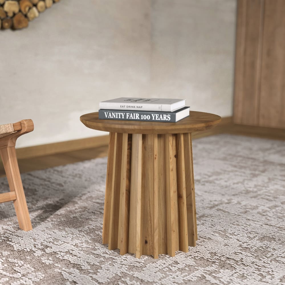Beistelltisch Suzon aus massivem Akazienholz – Die sanften und strukturierten Kurven des Beistelltisches Suzon aus massivem Akazienholz verleihen Ihrem Interieur Eleganz und Raffinesse.Sein geschnitzter Sockel mit sorgfältigen geometrischen Linien verleiht ihm eine skulpturale und originelle Ausstrahlung. Gefertigt aus Akazienholz, bekannt für seine Langlebigkeit und Widerstandsfähigkeit, insbesondere gegen Feuchtigkeit, verbindet dieser Tisch Ästhetik und Praktikabilität.-Abmessungen : Durchmesser: 45 cm Höhe: 42 cmMaterialien: Tischplatte und Gestell aus AkazienholzZusätzliche InformationenMaximales Gewicht: 20 kgDie Holzfarbe kann je nach den einzigartigen Eigenschaften jeder Massivholzplatte, wie Knoten und Trocknung, variieren.Montage : keine SelbstmontageGewicht : 7.65kgPflege : Vermeiden Sie stehendes Wasser und Hitze, und verwenden Sie einen speziellen Balsam oder Wachs für Naturholz.Paketinformationen : 51 x 51 x 46,5 cmRezyklierbarkeit : Vollständig recycelbar