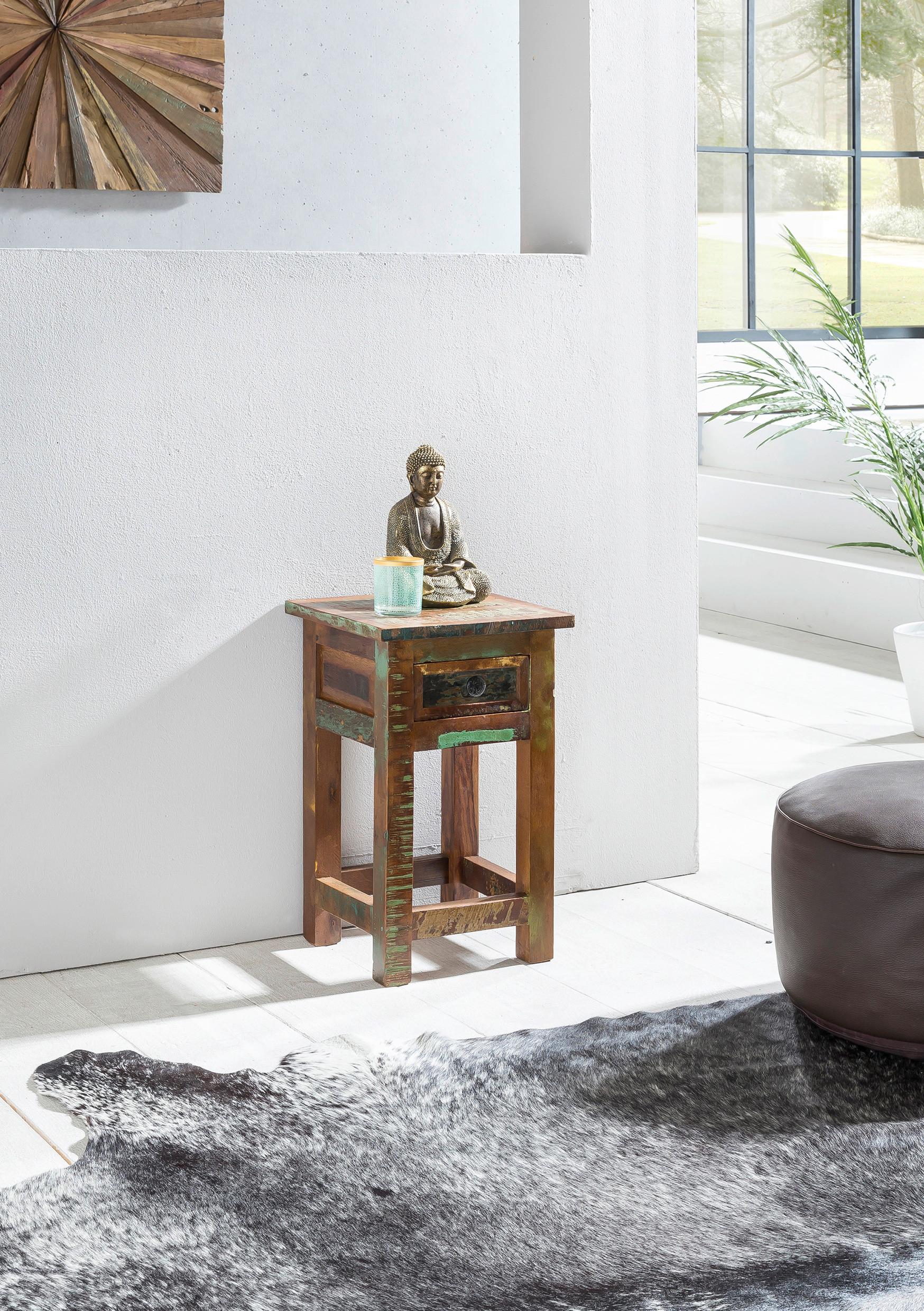 Mit diesem Beistelltisch aus Mango-Altholz setzen Sie ein Zeichen für Nachhaltigkeit. Der schlanke Beistelltisch mit einer Größe von ca. 30 x 30 x 50 cm (B x H x T) in Braun ist mit Wasserlack behandelt und punktet zudem mit einer individuell gestalteten Oberfläche im Used-Look. Er verfügt außerdem über 1 Schublade mit Knopfgriff in Schwarz. Mit einer Materialstärke von ca. 15 mm ist der stabile und flexible Beistelltisch bis max. 30 kg belastbar. HINWEIS Dieser Artikel wird in unseren Filialen nicht ausgestellt, ist dort jedoch einfach und bequem bestellbar und wird direkt zu Ihnen nach Hause geliefert. Bitte beachten Sie, dass die abgebildete Dekoration im Lieferumfang nicht enthalten ist.