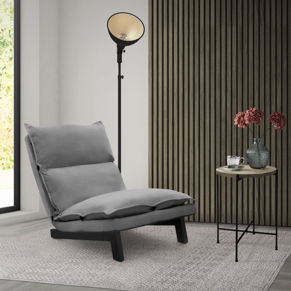 Der Bezug aus Leinen verleiht ihm eine natürliche, stilvolle Optik und sorgt in Kombination mit der weichen Polyesterpolsterung für ein angenehmes Sitzgefühl. Das pulverbeschichtete Stahlgestell bietet hohe Stabilität, während die Rückenlehne sich in fünf Stufen von 90° bis 180° verstellen lässt – ideal zum Sitzen, Zurücklehnen oder Entspannen.