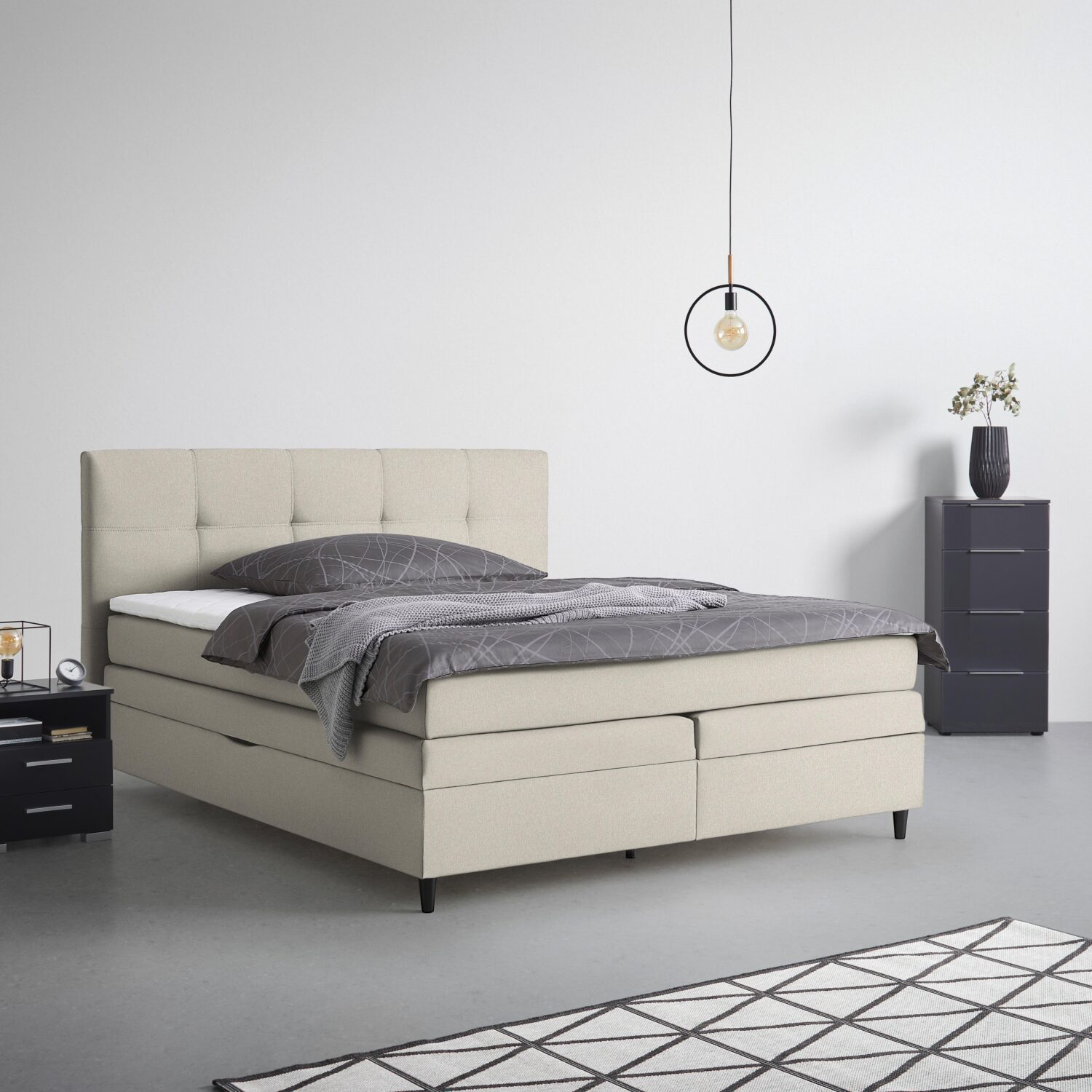 Entdecken Sie unser modernes Boxspringbett in Taupe und mit einer komfortablen Liegefläche von ca. 180×200 cm! Dieses Bett kombiniert stilvolles Design mit praktischer Funktionalität und bietet dank des integrierten Bettkastens zusätzlichen Stauraum für Ihre persönlichen Gegenstände. Hergestellt aus strapazierfähigem Textil und hochwertigem Holzwerkstoff überzeugt dieses Boxspringbett durch seine Langlebigkeit und seine moderne Ästhetik. Das gepolsterte Kopfteil in Taupe verleiht Ihrem Schlafbereich eine gemütliche Atmosphäre und lädt zum Entspannen ein. Mit einer Gesamthöhe von ca. 116 cm und einer bequemen Liegehöhe von ca. 67 cm bietet dieses Bett optimalen Komfort für erholsame Nächte. Die durchgehende Federkernmatratze und der Kaltschaumkern-Topper sorgen für eine angenehme Liegefläche und unterstützen Ihren Körper während des Schlafs. Die schwarzen Holzfüße verleihen dem Bett eine moderne Note und komplettieren das Gesamtbild perfekt. Bestellen Sie jetzt und verwandeln Sie Ihr Schlafzimmer in eine Wohlfühloase der Extraklasse!
