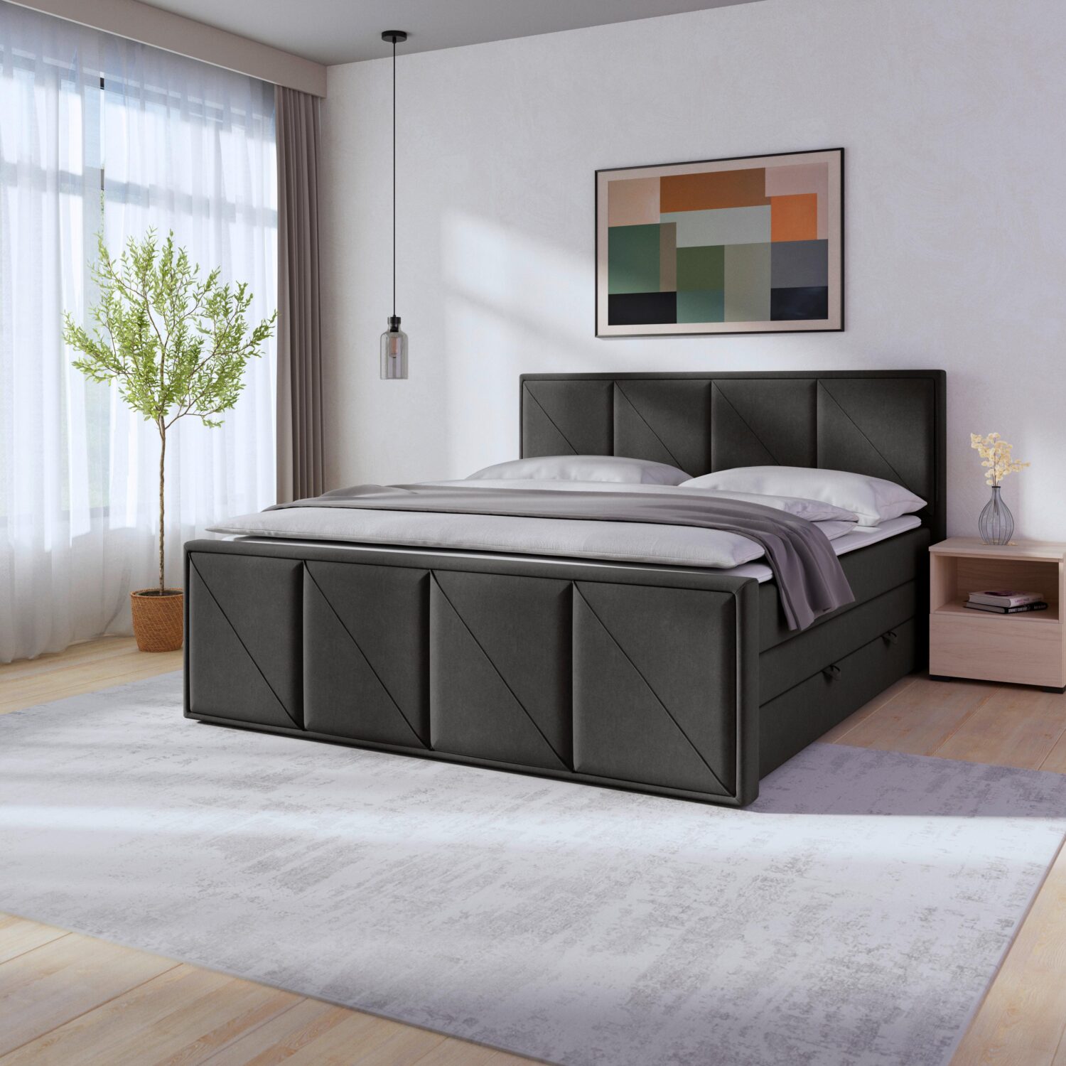 Das Boxspringbett OSLO in Anthrazit überzeugt mit seinem modernen Design und bietet Ihnen einen erstklassigen Schlafkomfort. Ausgestattet ist das ca. 180 x 200 cm große Bett mit einem praktischen Bettkasten, der zusätzlichen Stauraum für Decken, Kissen oder andere Dinge bietet. Der anthrazitfarbene Bezug verleiht dem Bett eine elegante Note und fügt sich harmonisch in jedes Schlafzimmer ein. Das Boxspringbett OSLO ist nicht nur ein Ort zum Schlafen, sondern auch ein stilvolles Möbelstück, das Ihr Schlafzimmer bereichert.