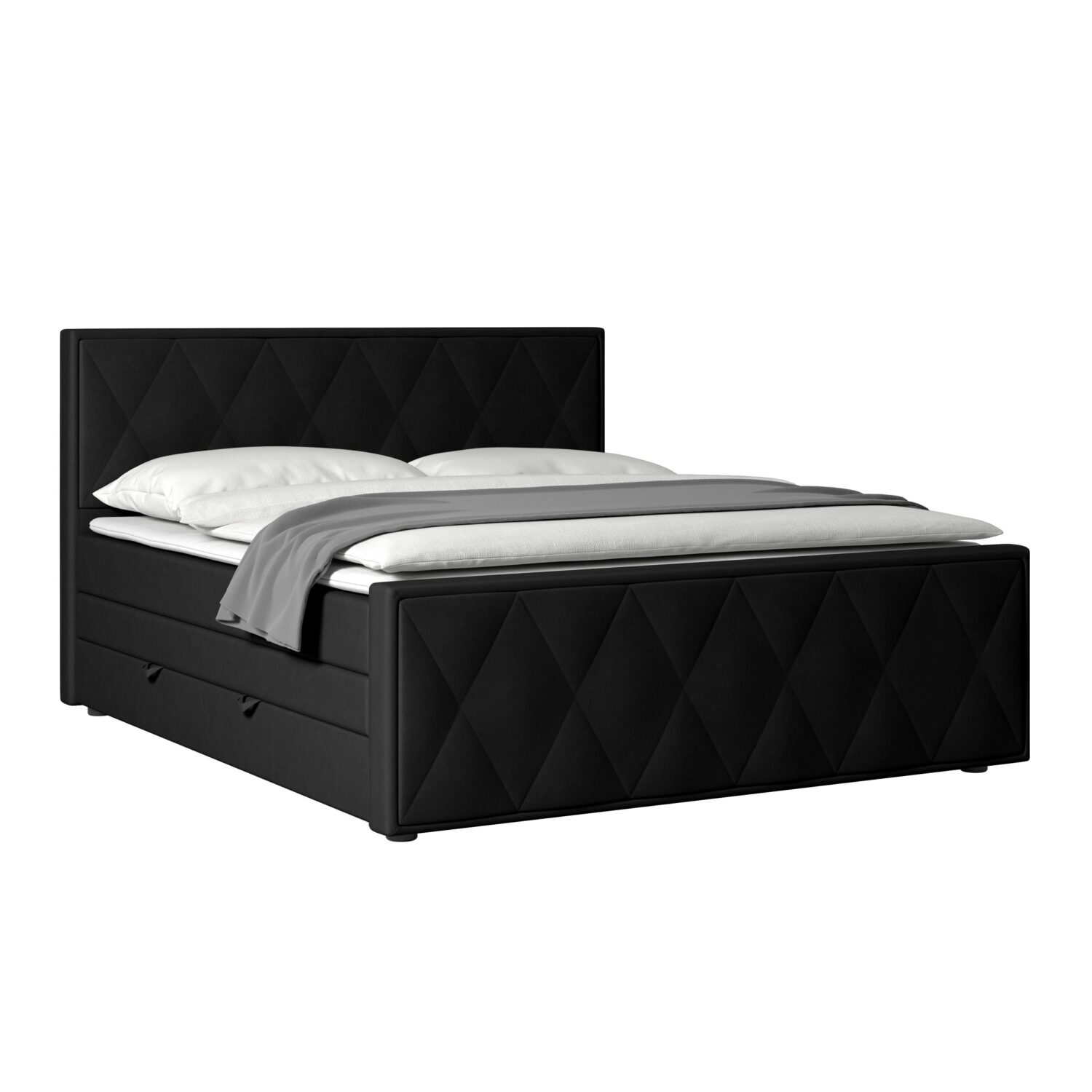 Schaffen Sie ein stilvolles und elegantes Ambiente mit dem Boxspringbett Porto, das durch sein modernes Design und hohen Schlafkomfort überzeugt. Der elegante schwarze Polyesterbezug mit dekorativen Ziernähten verleiht dem Bett eine edle Optik, während das gepolsterte Kopfteil mit einer Höhe von ca. 113 cm für zusätzlichen Komfort sorgt. Die Ziernähte setzen sich am Fußteil fort und unterstreichen das harmonische Design. Dank des integrierten Bettkastens bietet das Bett zudem praktischen Stauraum für Bettwäsche oder andere Utensilien. Die stabile Basis bildet eine ca. 35 cm hohe Box aus hochwertigem Echtholz (teilmassiv, Hartholz) mit Bonellfederkern, die für eine langlebige Konstruktion und optimale Federung sorgt. Für einen erholsamen Schlaf liegt darauf eine hochwertige 7-Zonen-Taschenfederkern-Matratze mit Härtegrad H2+H2 (mittel, bis ca. 80 kg), die sich ideal an den Körper anpasst und Druckpunkte gezielt entlastet. Ergänzt wird das Schlafsystem durch einen ca. 5 cm hohen Viscoschaum-Topper, der sich perfekt an die Körperkonturen anschmiegt. Der Bezug