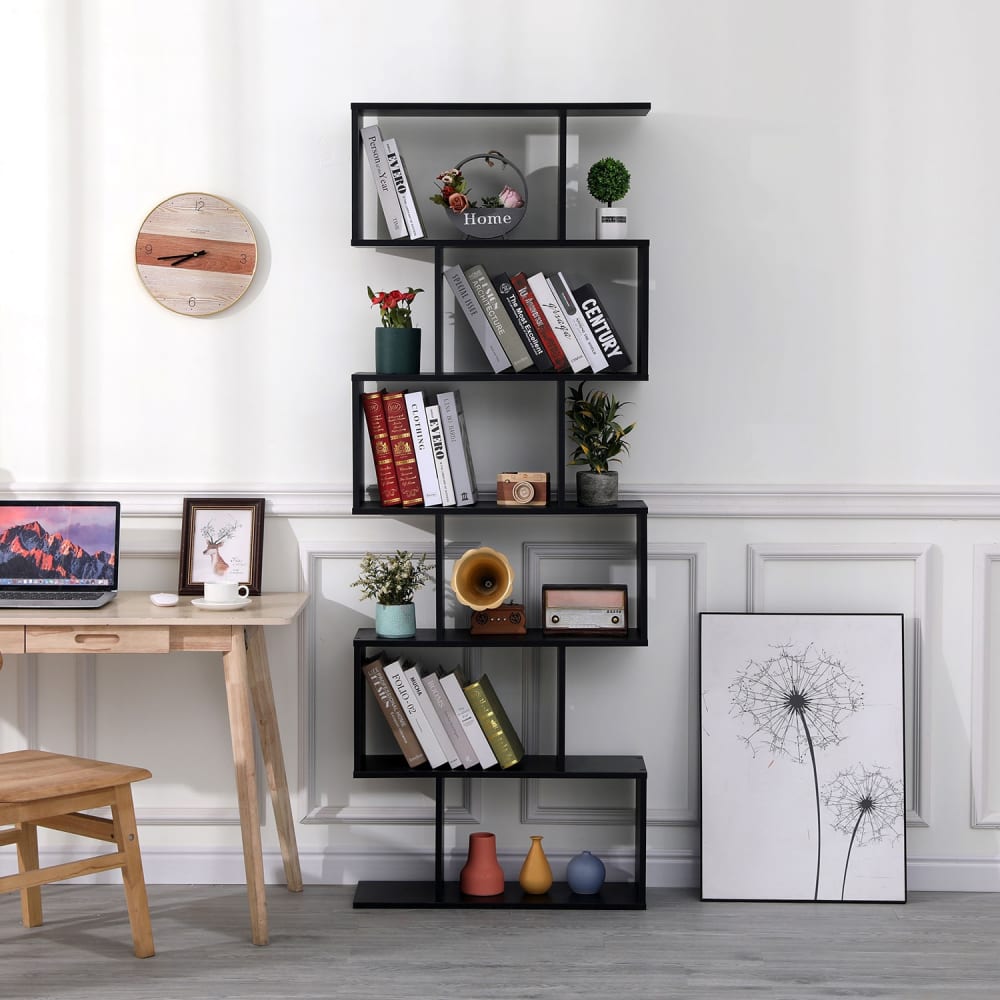 Dieses Bücherregal hat ein modernes und sehr originelles Design und wird sicher neidische Blicke auf sich ziehen, wenn Sie Gäste bei sich zu Hause empfangen. Es eignet sich hervorragend als stilvolle und elegante Dekoration für eine Sitzecke im Wohnzimmer oder eine Wand im Schlafzimmer. Es hat 6 vertikale Regale, die versetzt angeordnet sind, um einen erstaunlichen Stileffekt zu erzielen. Hier können Sie Ihre Bücher, Romane und Zeitschriften aufbewahren und Ihre Dekorationsgegenstände aufstellen, um dieses Stück Wohnmobiliar noch mehr zu verschönern. Das robuste und elegante Bücherregal VIRGINIA ist das richtige Möbelstück, um Ihr Zuhause zu vervollständigen und es nach Ihrem Geschmack und mit Stil zu dekorieren. Details: Abmessungen: Bücherregal: L 70 × B 23,5 × H 190,5cm, Fach: L 47,1 × B 23,5 × H 30cm, Kleines Regal: L 19,6 × B 23,5 × H 30cm . Materialien : Struktur: MDF . Farben : Struktur: schwarz . Zusätzliche Informationen : Maximal unterstütztes Gewicht: 25kg, 6 Fächer, 6 Regalfächer, Zum Zusammenbauen (inkl. Anleitung).