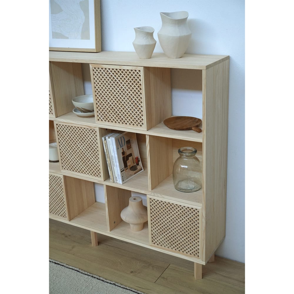 Mit unserem Regal können Sie Ihrer Kreativität freien Lauf lassen. Die 3 oder 6 Schiebetüren, die Sie aus unserem schönen Gitterwerk auswählen können, ermöglichen es Ihnen, das Aussehen des Regals nach Ihrem Stil und Ihren Vorlieben zu gestalten.
