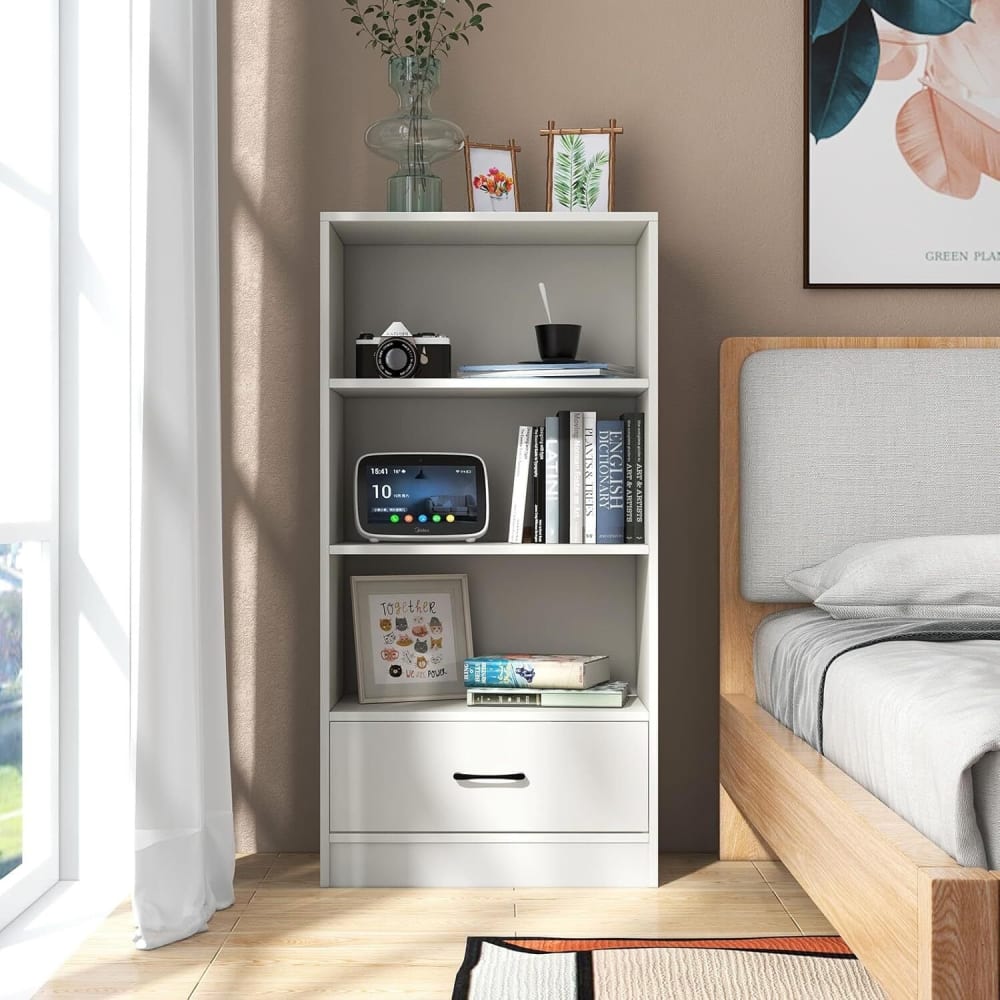 Viel Stauraum: Das Aufbewahrungsregal mit drei offenen Regalen und einer unteren Schublade bieten viel Stauraum für Bücher, Dekoration, Topfpflanzen und andere alltägliche Gegenstände, so dass Sie einen ordentlichen und komfortablen Wohnraum haben.
