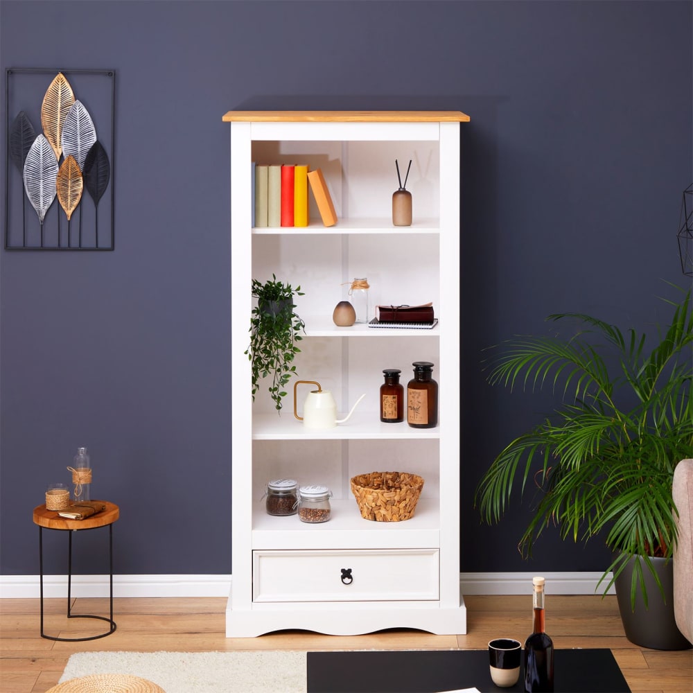 verfügt über 3 stabile Einlegeböden und somit über 4 grozßzügige und offene Fächer für Ihre Bücher oder Ihr Dekomaterial. Zudem hat unser Bücherregal einen Schubkasten für weitere Verstauungsmöglichkeiten. Der Bücherschrank passt sich perfekt, durch seine natürliche Schönheit, an Ihren Einrichtungsstil an. Schaffen Sie sich ein gemütliches Zuhause und kombinieren Sie dieses Bücherregal mit unseren weiteren Möbeln der Mexico Serie.