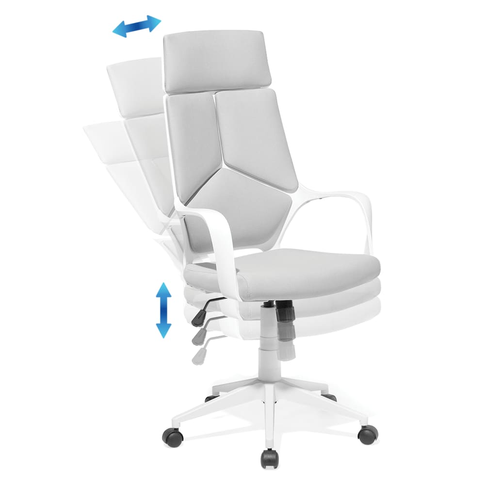 Der Chefsessel begeistert mit moderner, sportlicher Ausstrahlung und praktischer Funktionalität. Die Wippmechanik für entspanntes Zurücklehnen, die stufenlos höhenverstellbare Sitzhöhe und das um 360 Grad drehbare Fußkreuz sorgen dafür, dass Sie auch bei langem Arbeiten am Schreibtisch immer noch bequem sitzen. Die angenehm gepolsterte Sitzfläche bieten besonders viel Sitzkomfort. Die hohe Rückenlehne verfügt über eine integrierte Kopfstütze. Bei der Farbgestaltung wurde das weiße Gestell aus Kunststoff mit einem strapazierfähigen, grauen Bezug kombiniert.