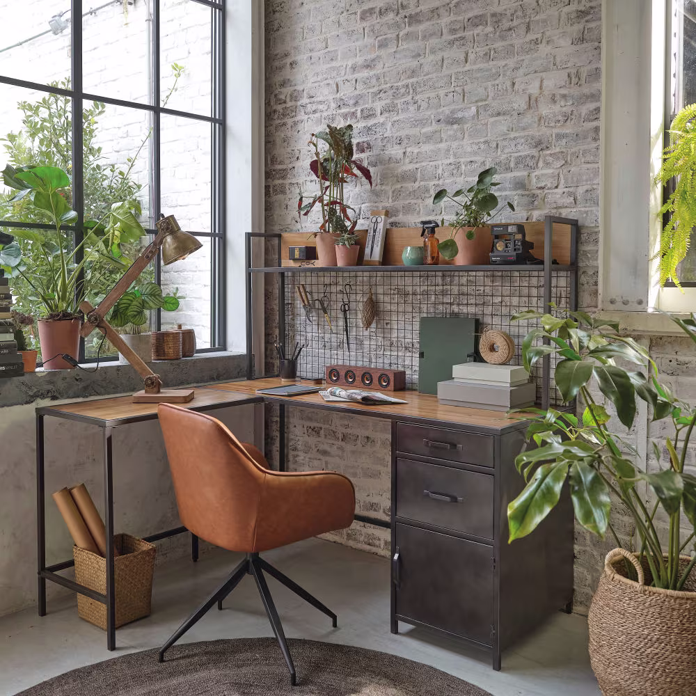Wer hat gesagt, Arbeit und Vergnügen ließen sich nicht miteinander vereinbaren? Mit dem Drehstuhl WILLY ist nichts leichter als das! Wir lieben den braunen Bezug aus beschichtetem Stoff dieses Sessels, genau wie seinen Retro-Look. Sein Fußgestell aus schwarzem Stahl liegt im Trend und verleiht ihm eine tolle Allüre. Dank diesen Details passt der Stuhl genauso gut in eine Vintage-Deko wie in eine Einrichtung im Industrial-Stil. Der Korpus aus FSC-zertifiziertem Holz dieses Drehstuhls mit Armlehnen ist gut gepolstert und ermöglicht eine bequeme Sitzposition beim Arbeiten. Ihnen gefällt der Stil dieses Bürostuhls? Dann werfen Sie unbedingt einen Blick auf seine Esstischstuhl-Variante