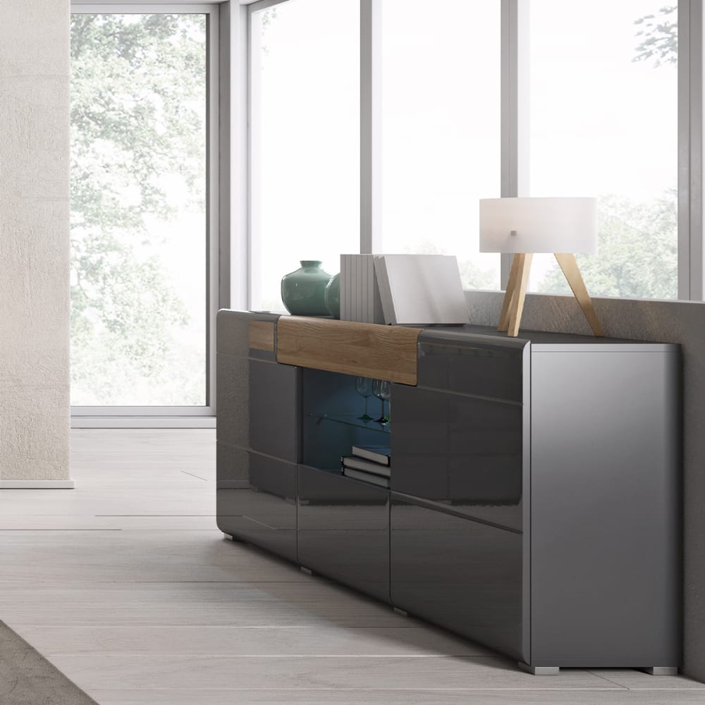 Sideboard 3 Türen 1 Schublade Jules Grau und HolzEuropäische Herstellung Kollektion :: Jules Farbe : Anthrazitgrau lackiert und Holz in Eichenoptik Materialien : Laminierte SpanplattenRegal aus gehärtetem GlasFSC-zertifiziertes Holz aus nachhaltiger Forstwirtschaft Eigenschaften: 3 Türen1 Nische mit 1 Einlegeboden aus Sicherheitsglas4 Einlegeböden, davon 2 herausnehmbar1 SchubladeLEDNicht inbegriffen Gewicht und Maße: 67 kg159 x 39 x 82 cm Produkt geliefert, zum Zusammenbauen, Anleitung enthalten Produkt mit 24 Monaten Garantie Sicherheitsanweisungen: Möbel korrekt montieren Empfohlene maximale Belastung laut Anleitung einhalten Möbel fest an der Wand befestigen Gesamtanzahl der Kartons : 2 Gesetzlicher Vertreter: NAPKINS, 30-34 avenue Henri Matisse, 06200 Nizza, FRANKREICH