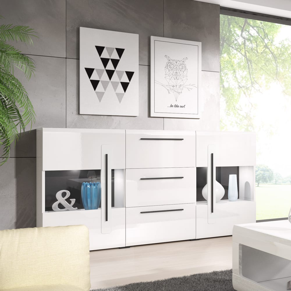 Sideboard 2 Türen 3 Schubladen mit LED Louis BlancEuropäische Herstellung Kollektion :: Louis Farbe : Weiß lackiertSchwarze Griffe Materialien : Laminierte SpanplattenGlasvitrineFSC-zertifiziertes Holz aus nachhaltiger Forstwirtschaft Eigenschaften: 2 Glastüren3 Schubladen4 feste EinlegebödenSchubladen mit Silent-Close-System ausgestattet2 LEDs mit weißem Licht, die mit einem Knopfdruck an die Steckdose angeschlossen werden können Gewicht und Maße: 88 kg180 x 39 x 103 cm Produkt geliefert, zum Zusammenbauen, Anleitung enthalten Produkt mit 24 Monaten Garantie Sicherheitsanweisungen: Möbel korrekt montieren – Empfohlene maximale Belastung laut Anleitung einhalten – Möbel fest an der Wand befestigen Gesamtanzahl der Kartons : 3 Gesetzlicher Vertreter: NAPKINS, 30-34 avenue Henri Matisse, 06200 Nizza, FRANKREICH