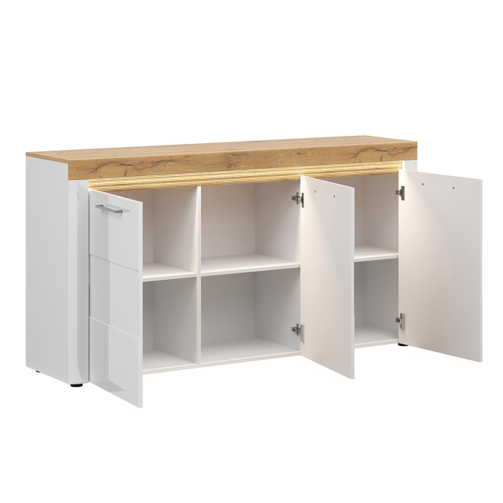 3-türiges Sideboard mit LED Nara Weiß und HolzEuropäische Herstellung Kollektion :: Nara Farben: Weiß lackiert und Holz in Eichenoptik Materialien : MDF und laminierte Platten Eigenschaften: 3 Türen6 NischenInklusive LED-LeisteLEDs zum Anschließen an die Steckdose mit Ein-/AusschalterTüren mit Silent-Close-System Produktgewicht und Abmessungen : 61 kg170 x 42 x 90 cm Produkt geliefert, zum Zusammenbauen Produkt mit 12-monatiger Garantie. Gesamtanzahl der Kartons : 3