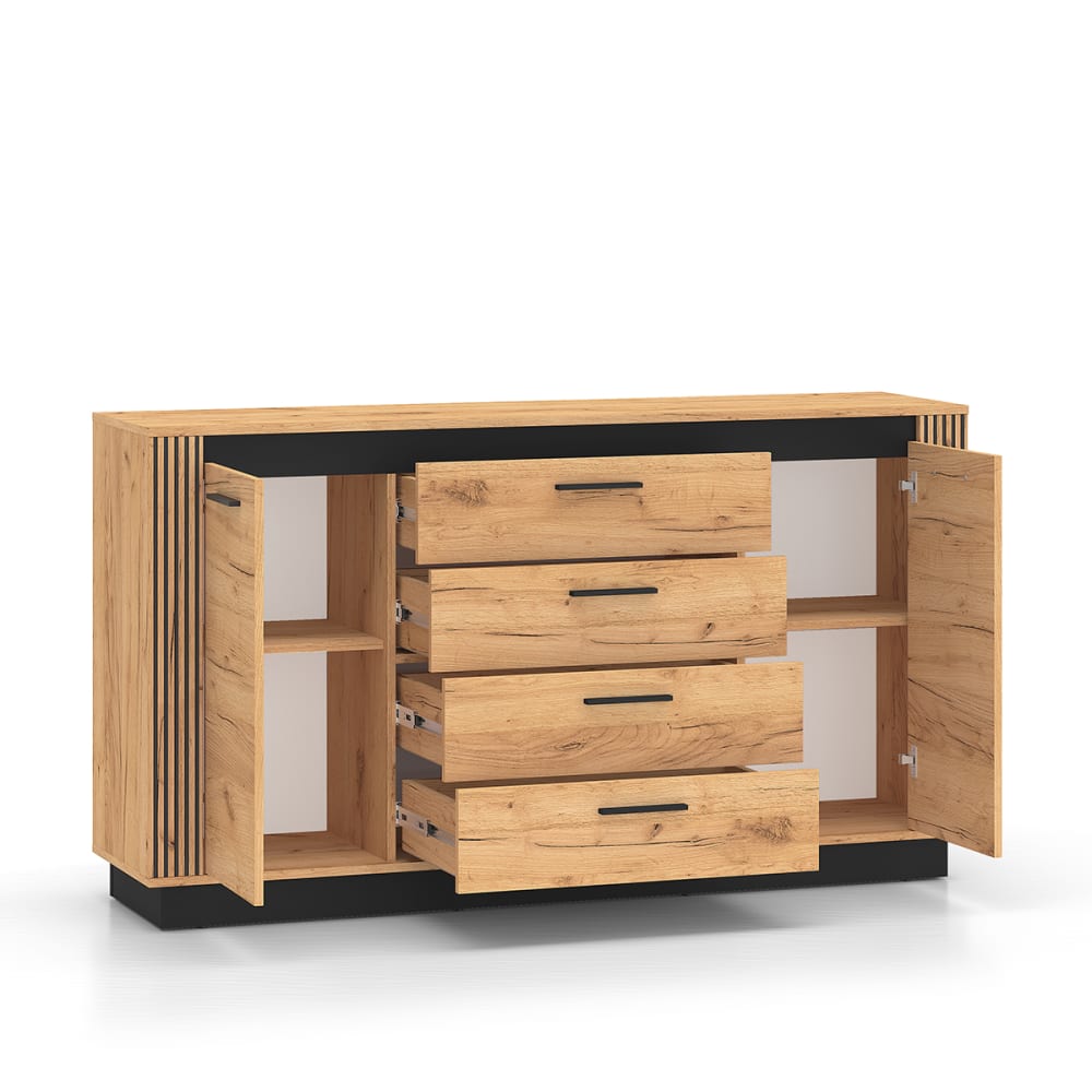 Sideboard 2 Türen 3 Schubladen Solal Holz und SchwarzKollektion :: Solal Europäische Herstellung Material: MDF-FrontplatteMelaminbeschichteter KorpusGute Kratzfestigkeit, Feuchtigkeits- und Temperaturbeständigkeit Farben: Holz in Goldeichenoptik Handwerker und Schwarz Eigenschaften: 2 Türen2 Einlegeböden4 Schubladen mit verstärkten BödenVollauszugTüren mit geräuschlosem Schließsystem Gewicht : 66 kg Maße: 160 x 40 x 90 cm Verpackung : Produkt wird geliefert, muss zusammengebaut werden, inkl. Anleitung. Garantie: 24 Monate Gesamtanzahl der Kartons : 2 Gewicht und Abmessungen der Kartons: 33 kg99 x 44,5 x 17,5 cm / 32,5 kg173 x 46,5 x 9 cm Gesetzlicher Vertreter: NAPKINS, 30-34 avenue Henri Matisse, 06200 Nizza, FRANKREICH