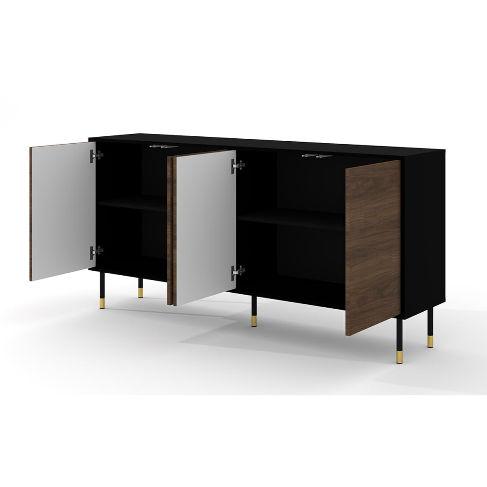 Sideboard 4-türig Rani Holz und SchwarzKollektion :: Rani Materialien : LaminatplattenMDF-PlattenMetallfüße Farben: Korpus in MattschwarzGefräste Fronten in dunklem HolzFüße in Schwarz und Gold Merkmale: 4 Türen“Push to open“-SystemHöhe der Füße: 20 cm Gewicht und Maße: 36 kg180 x 40 x 60 cm Verpackung : Produkt wird geliefert, zum Zusammenbauen, inkl. Anleitung Garantie: 24 Monate Gesamtanzahl der Kartons : 2 Gewicht und Abmessungen der Kartons: 36 kg188 x 51 x 8 cm / 21 kg72 x 52 x 11 cm